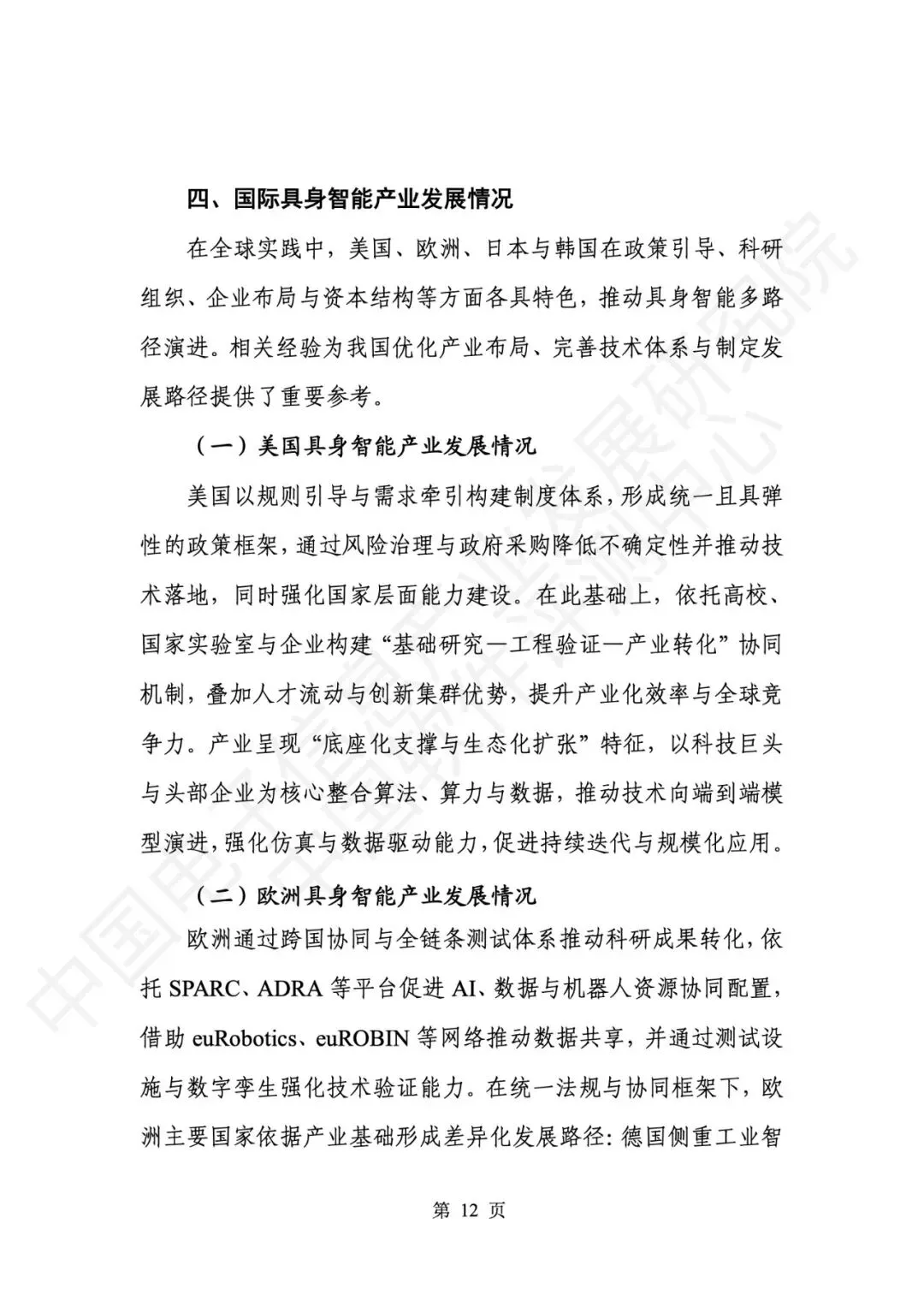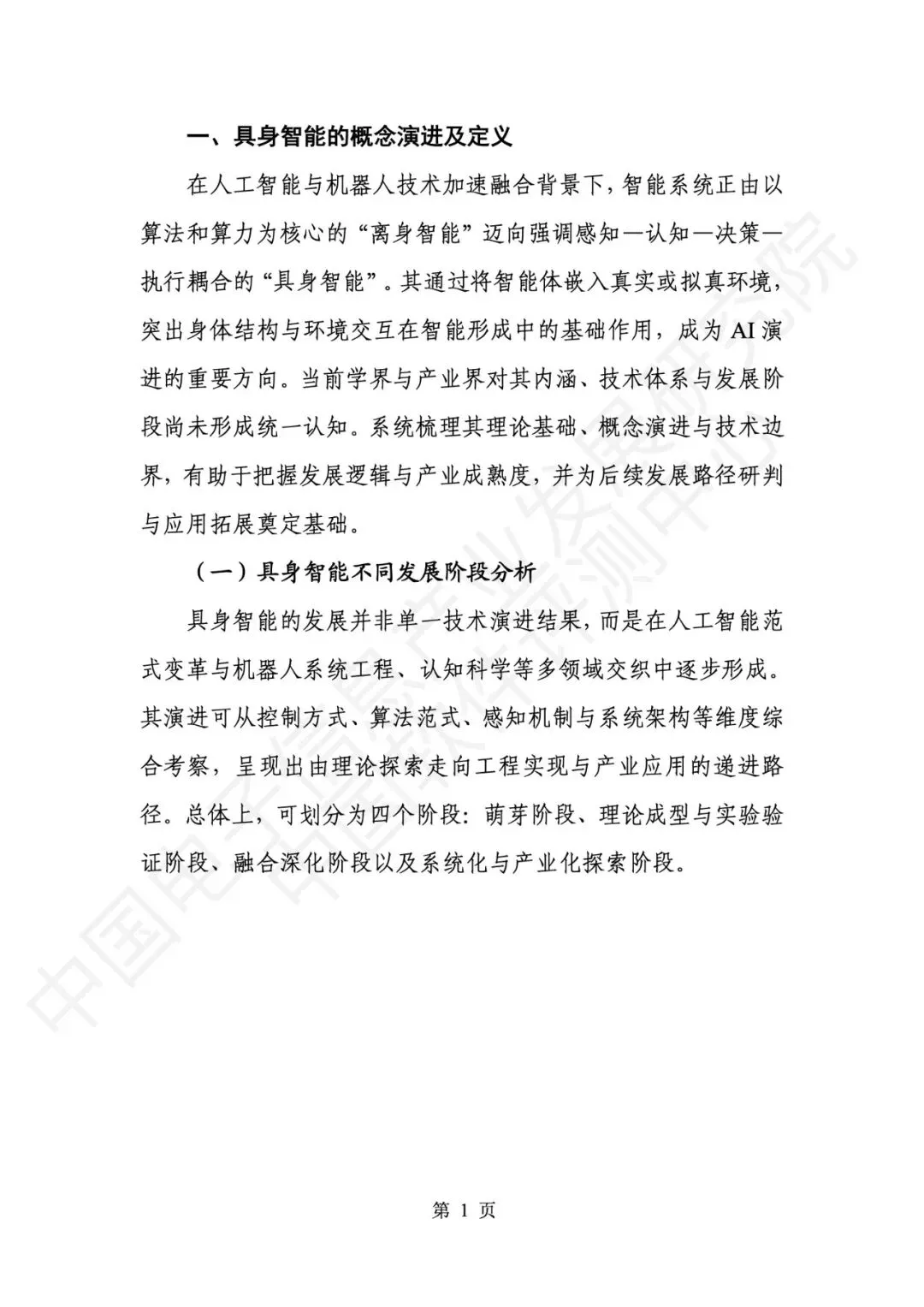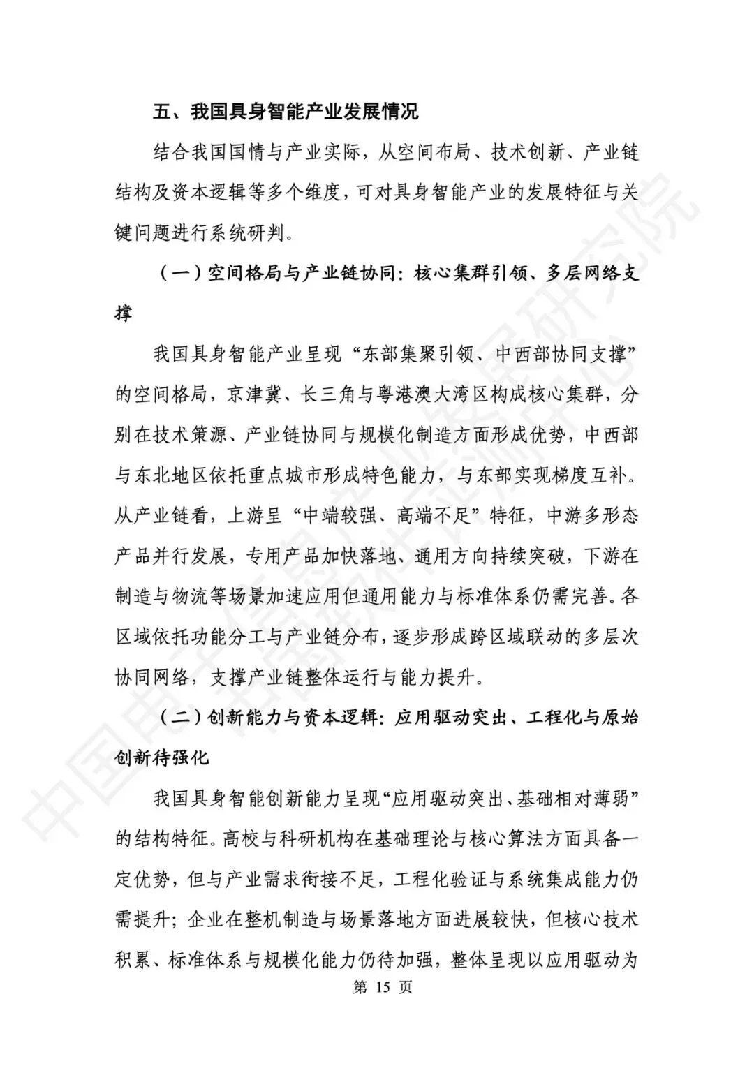 本报告针对具身智能技术和产业的新发展新趋势进行了系统分析:从具身智能概念演进与内涵界定切入,提出了具身智能的核心定义与机理特征,以及通用、专用、前沿三类具身智能产品分类形态;剖析出具身智能四层技术体系架构,从产业链结构、应用场景与资本动向等维度分析产业发展态势;综合比较全球主要国家和地区的具身智能产业发展路径,并从空间布局与创新能力等方面分析了国内产业发展现状及存在问题;在此基础上,对全球技术演进趋势、产业竞争格局及发展路径与治理框架进行了综合研判并提出方向性认识。