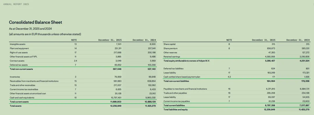 最后提一下,Adyen现金及等价物有107亿欧元(上期文章财报解读:Adyen2025年,综合资产负债表-现金及现金等价物),通过右侧的负债部分能看到,其中63亿是应付商户/金融机构的钱(Payables to merchants and financial institutions )(比如商户的待结算资金)。