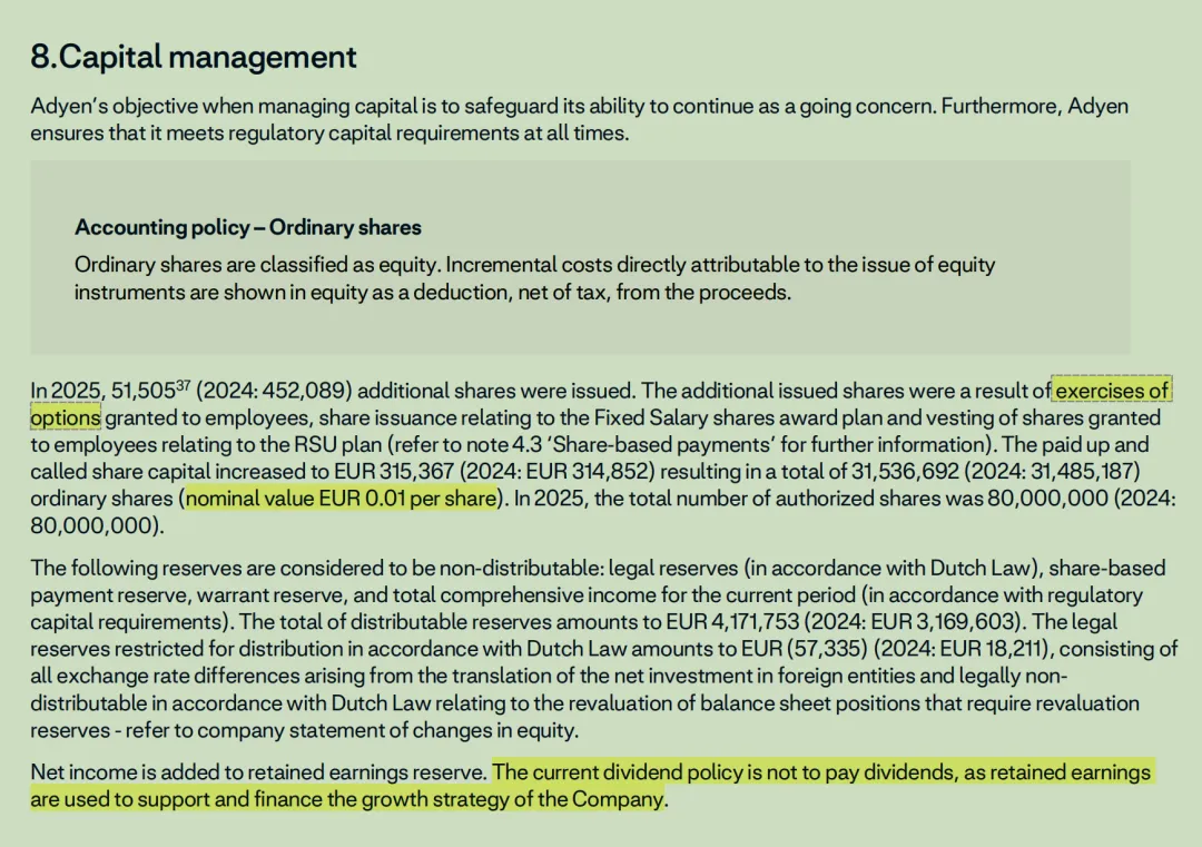 这种极致的“低面值”设计,让 Adyen 在 2025 年通过员工行权新发了 51,505 股,但股本只增加了不到 515 欧元。在几十亿规模的报表里,这简直可以忽略不计。