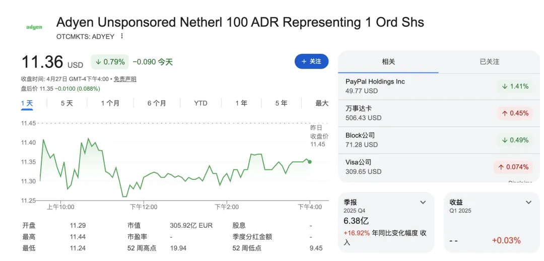 这个 11.36美元的价格,并不是 Adyen 在荷兰主板上市的原始股票,而是它的 ADR(美国存托凭证)。