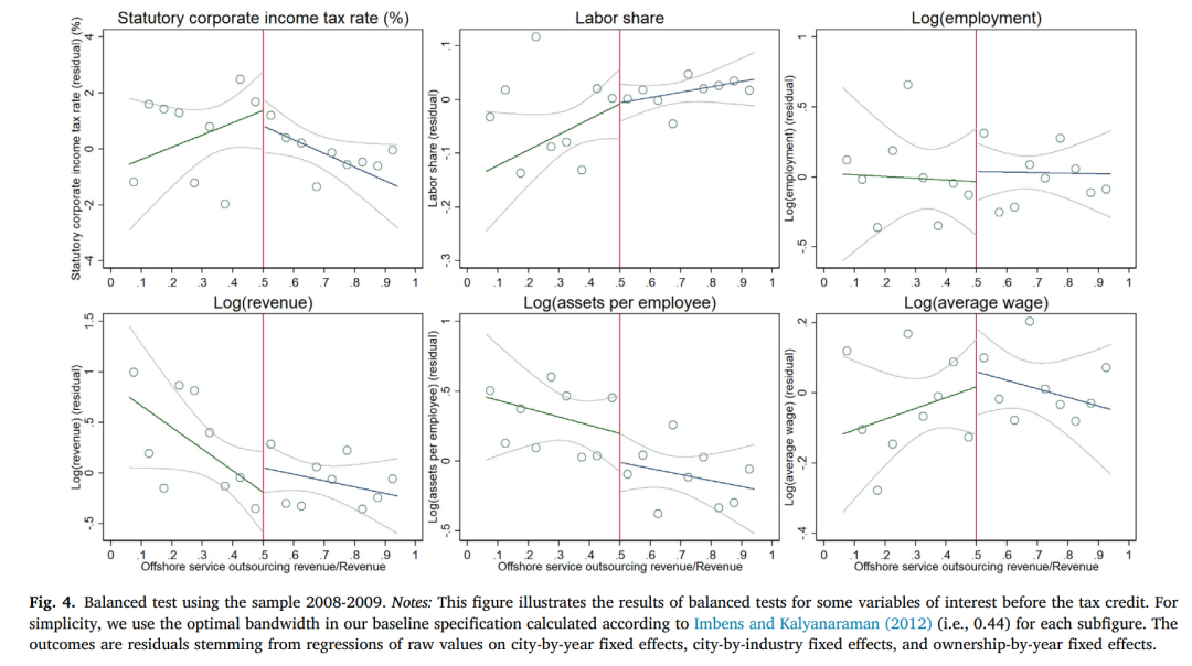 本文是极其扎实的因果推断研究,借助独特的政策冲击和独特的数据来源,实证识别了一个在微观和宏观上同样重要的问题。这一实证结果从微观主体出发,借助难得的政策情境,不仅揭示了税收政策对企业要素配置的微观效应,还对宏观上重要的劳动收入份额缩减问题给出了微观证据,形成了与Karabarbounis and Neiman(2014)的有效对话。