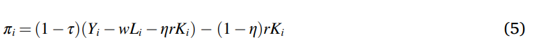 通过设定税率和资本投入中可免税的比重,企业的利润函数为: