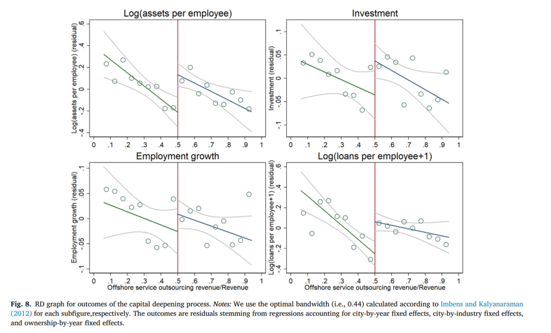 本文通过类似的RD方法,检验了资本深化的作用机制,如图所示在政策冲击后,50%分界点上下的企业呈现出资产比例、投资和人均信贷的明显上升。而在雇佣人数上上升并不显著。