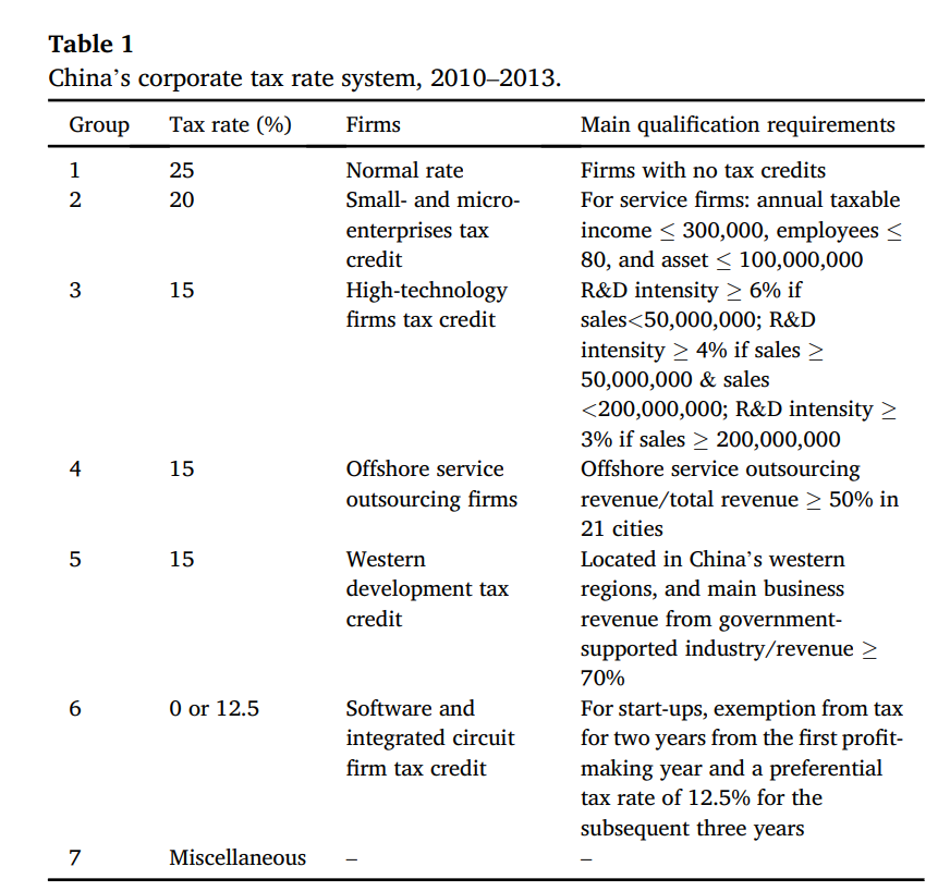 如文中表1所示,2010-2013年中国的所得税体系中,离岸服务外包企业由于OSO减税政策的出台,得以享受15%的第三档税率(和以研发强度评估的高新技术企业相同)。