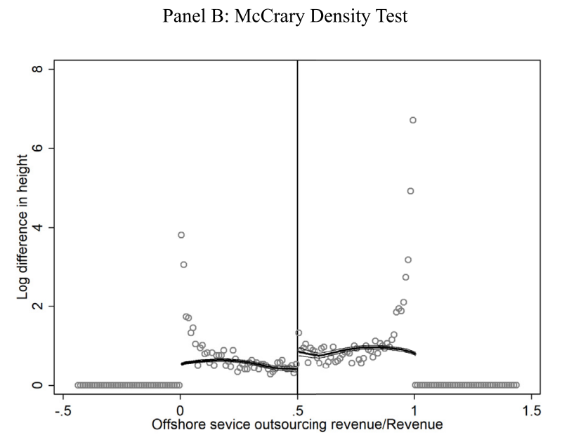 离岸服务外包企业主要指从事信息技术外包(ITO)、技术性业务流程外包(BPO)、技术性知识流程外包(KPO)的企业,OSO减税政策规定企业要满足三个条件以达到减税标准:(1)企业位于21个试点城市;(2)企业的OSO业务收入的占比达到当年总收入的50%;(3)企业超过50%的员工要拥有大学文凭。由于第三条标准易于操纵,且样本中很少有企业因为第三条标准未满足而无法满足减税要求,因此我们采用第二条标准作为断点回归的设计依据。