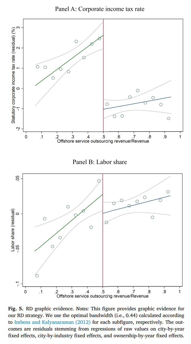 来自中山大学的李兵、来自中国人民大学的刘畅以及来自香港城市大学的孙腾发表在2021年JDE上的这篇文章呼应了Karabarbounis and Neiman(2014)的这一假说,并巧妙利用中国企业所得税减免的政策冲击,利用回归断点设计的方法证明了税收减免带来的资本成本下降会负向影响劳动收入份额。本文揭示了资本深化的进程会逐渐引致劳动收入份额的降低,对劳动收入份额研究以及企业税后果的两支文献均有不错的贡献。