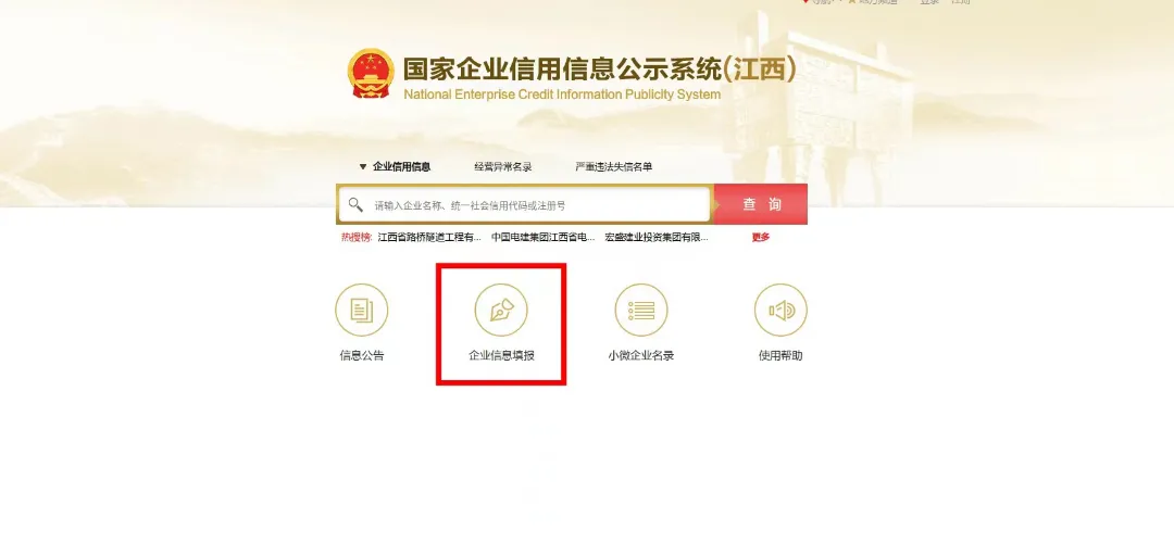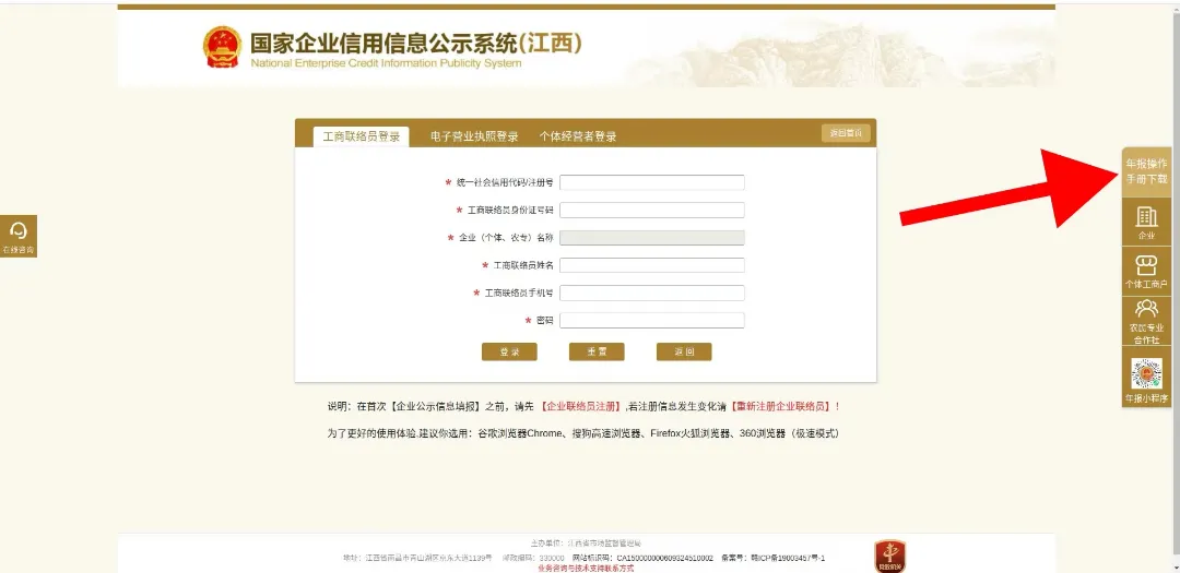 1、登录国家企业信用信息公示系统(江西)https://jx.gsxt.gov.cn/index.html,点击“企业信息填报”,登录页面右侧可下载年报操作手册,登录后即可填报企业信息