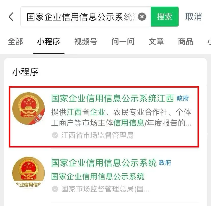 2、微信搜索小程序“国家企业信用信息公示系统江西”,打开小程序,点击“企业年报报送”进入登录页面