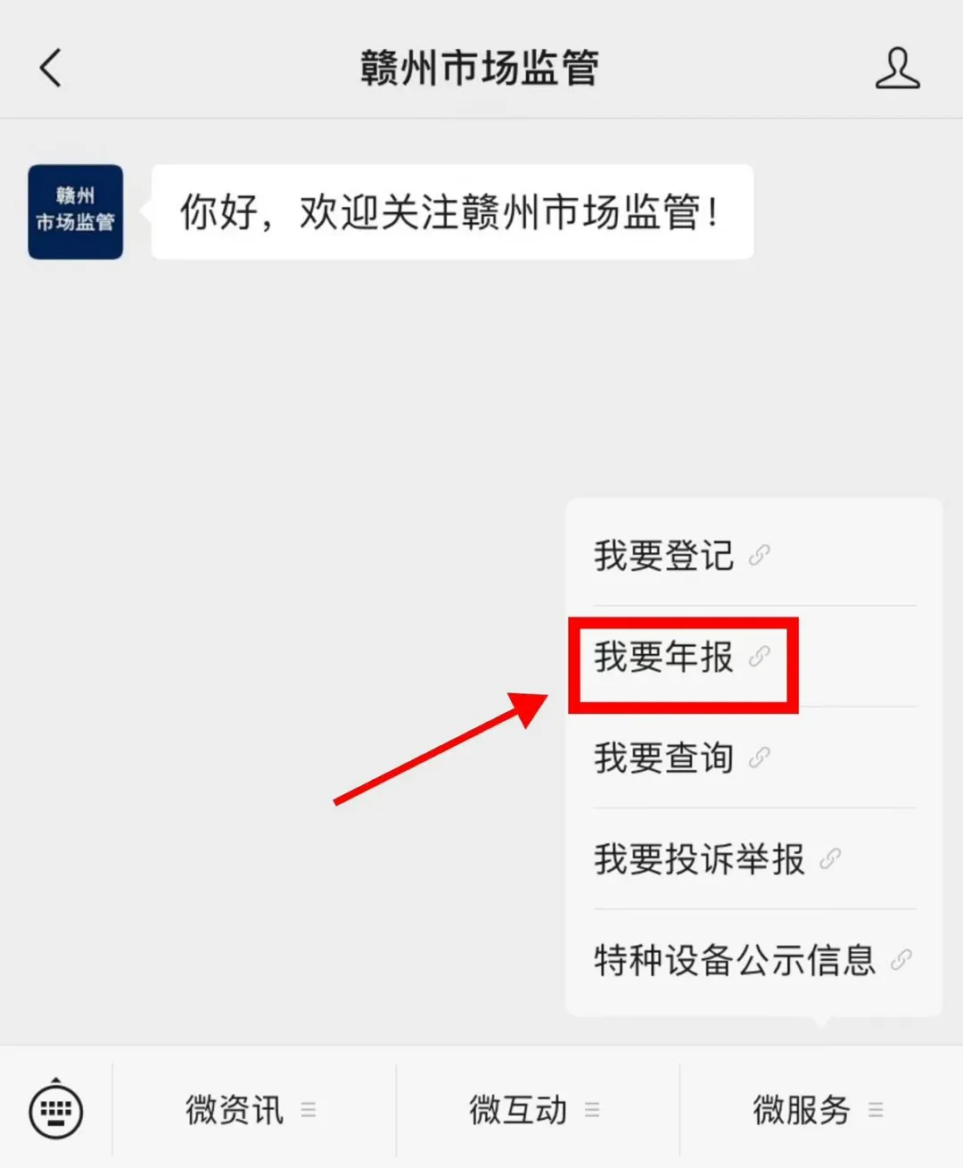 3、关注“赣州市场监管”微信公众号,在对话页面的右下角“微服务-我要年报”,点击进入即可在手机上填报