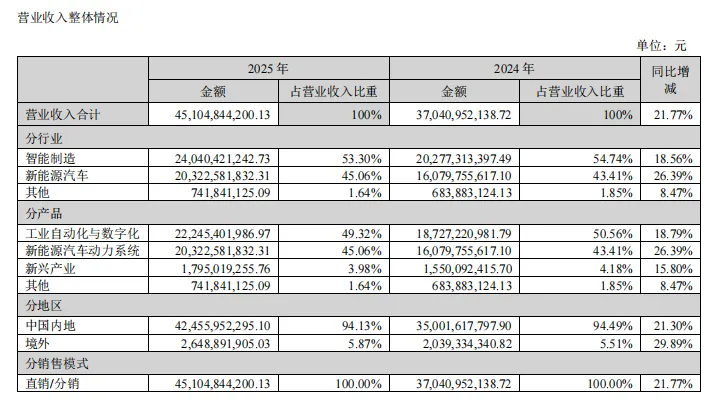 新能源汽车业务作为汇川增速最快的引擎,2025年实现营收约203亿元,同比增长约26%,成为公司第一增长曲线,电驱、电源、智能底盘产品批量落地主流车企。
