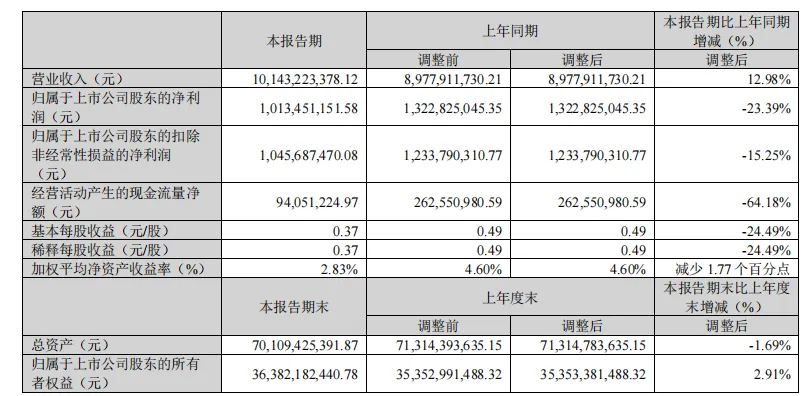 其中报告期内营业收入为101.43亿元,同比增长12.98%,连续保持双位数增长;归母净利润为10.13亿元,同比下降23.39%;归母净利润为10.13亿元,同比下降23.39%;整体毛利率29.08%,同比下降1.91个百分点。