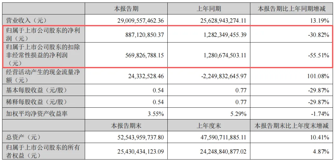 然而,最新的2026年一季报显示,公司出现“增收不增利”的情况。一季度营收达290.10亿元,同比增长13.19%;但归母净利润仅为8.87亿元,同比大幅下滑30.82%;扣非净利润更是腰斩,下滑55.51%。