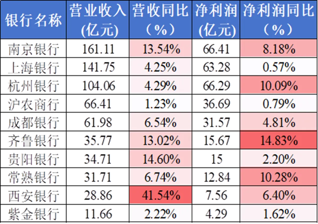 尽管10家银行全线实现正增长,但业绩与净利润的增速匹配差异显著。营收增速方面,西安银行以41.54%的增幅领跑,贵阳银行、南京银行紧随其后,而沪农商行仅同比增长1.23%,紫金银行同比增长2.22%。净利润增速方面,齐鲁银行以14.83%居首,常熟银行、杭州银行均超10%,而上海银行仅增0.57%,部分银行陷入“增收不增利”的困境。