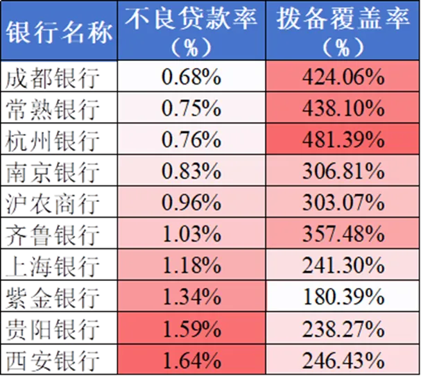 资产质量方面,10家银行整体保持平稳,但优劣差距清晰可见。成都银行、常熟银行、杭州银行不良率均低于0.8%,拨备覆盖率均超420%,风险抵补能力突出;南京银行、沪农商行不良率亦控制在1%以内。而贵阳银行、西安银行不良率分别达1.59%和1.64%,明显高于同业,资产质量承压。