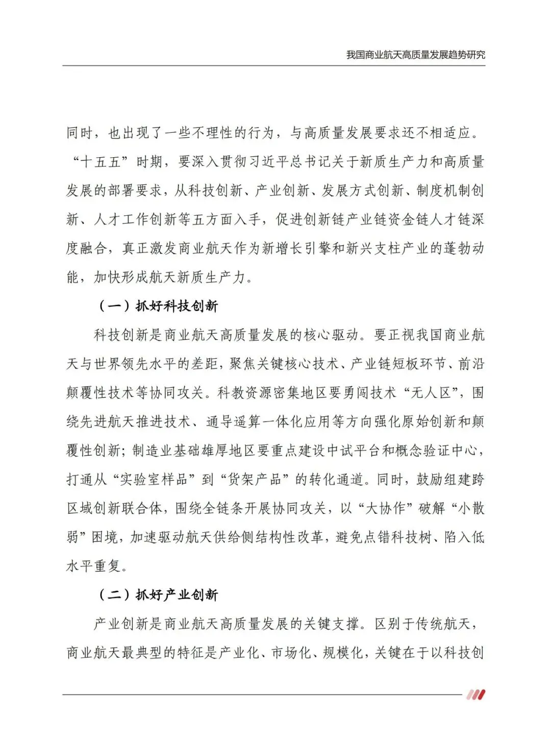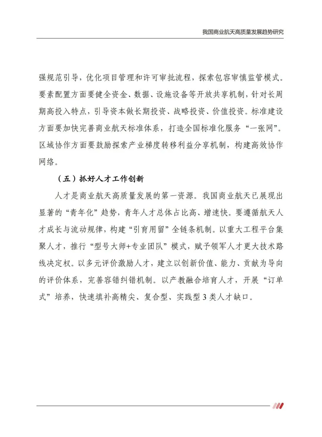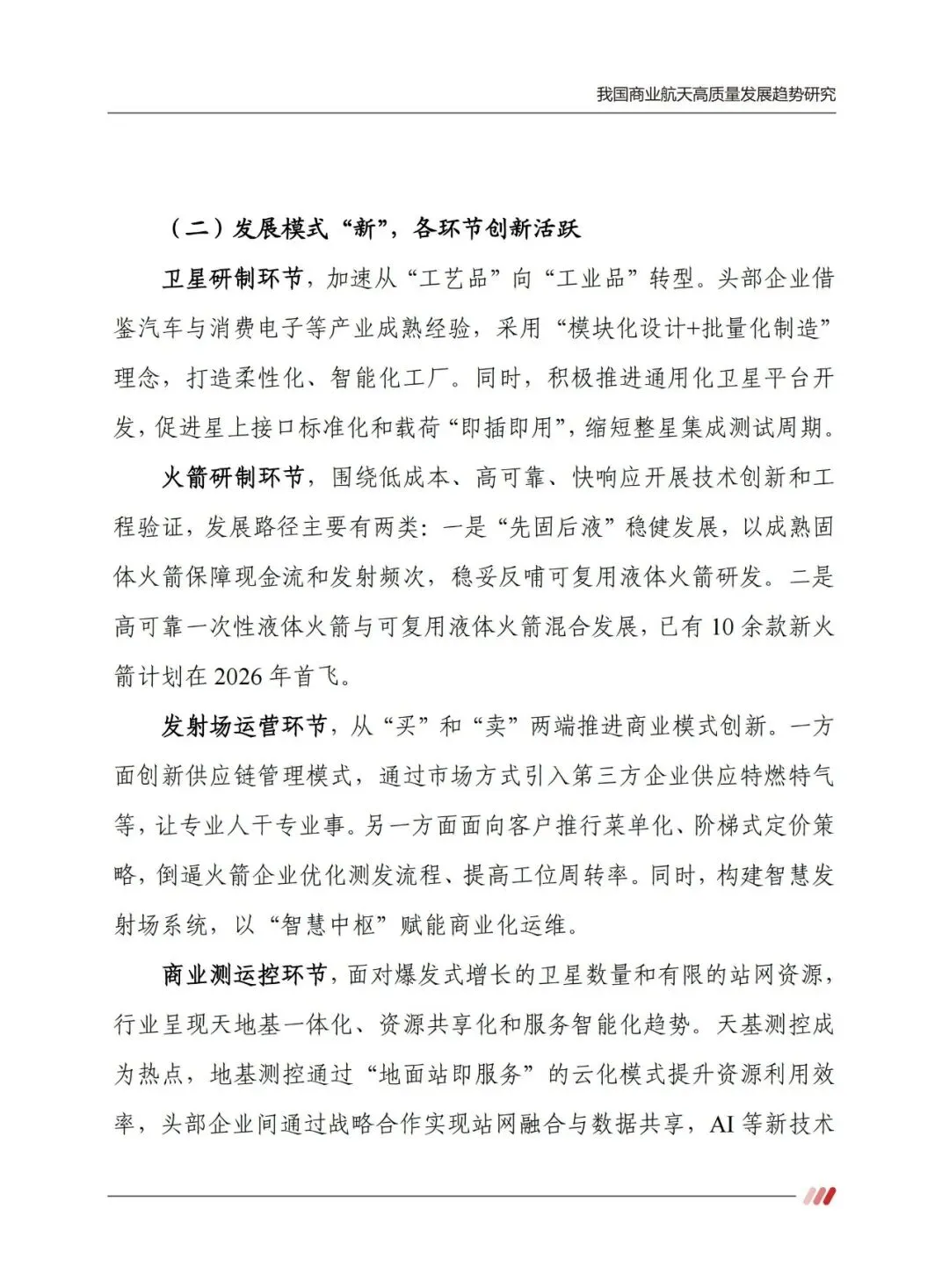 “十五五” 时期,商业航天需聚焦五大创新推动高质量发展。以科技创新攻克关键核心技术,搭建跨区域协同攻关体系;以产业创新完善生态,形成产业化、市场化、规模化闭环;以发展方式创新坚守安全绿色底线,推广绿色推进剂与可复用技术;以制度机制创新优化市场准入、要素配置与标准体系;以人才工作创新构建全链条引育用留机制,填补复合型人才缺口。