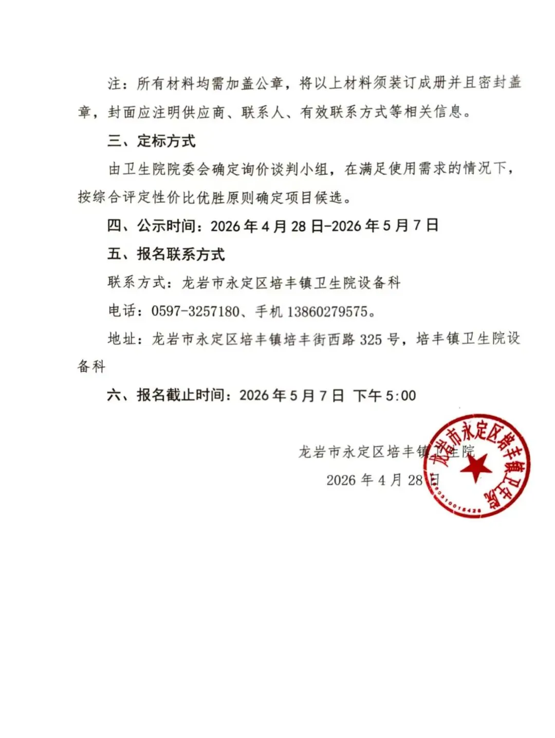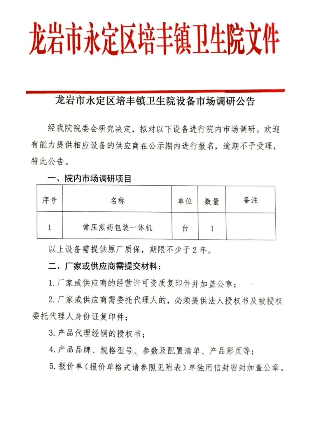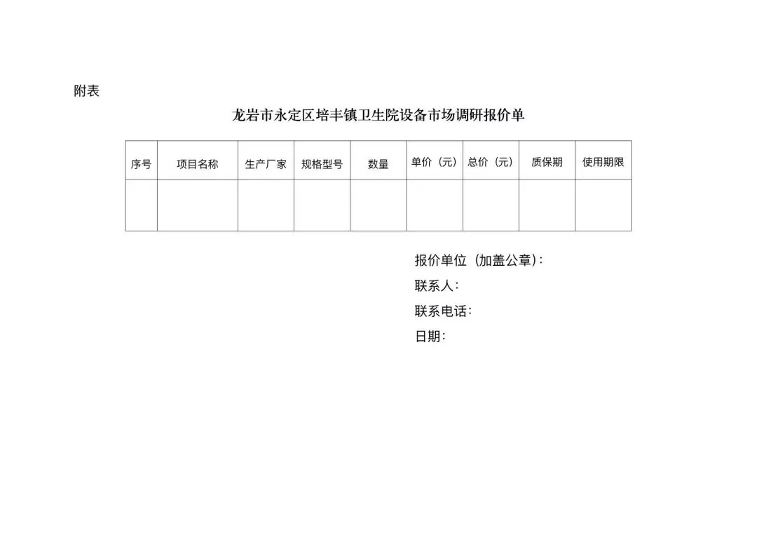 龙岩市永定区培丰镇卫生院设备市场调研公告