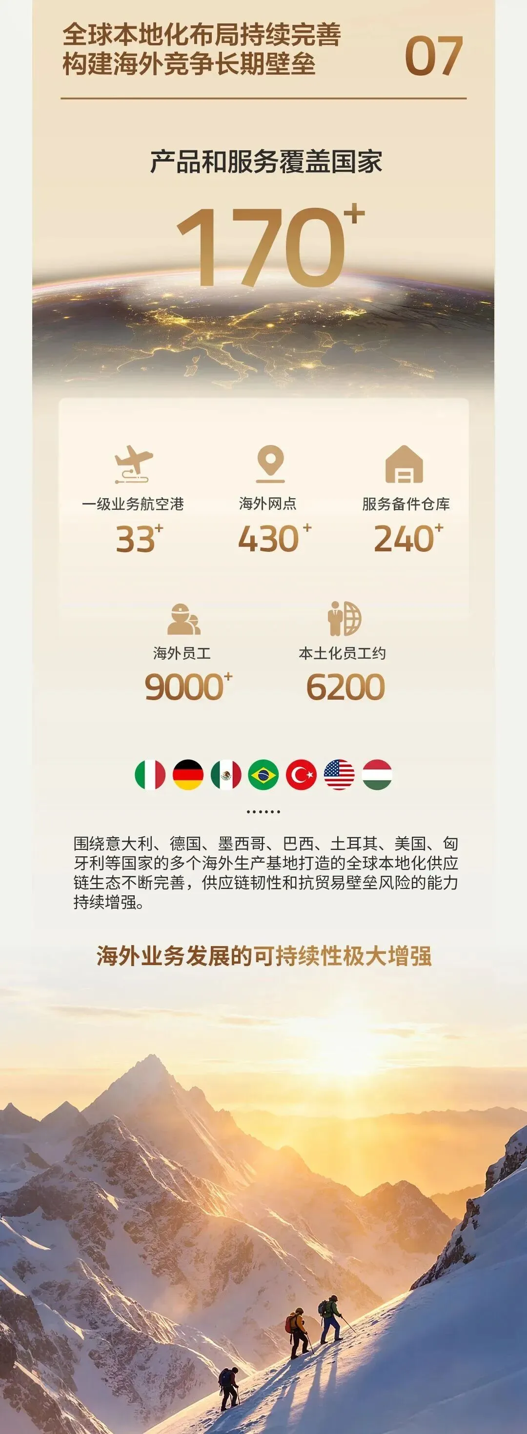 据公开消息,公司已经围绕意大利、德国、墨西哥、巴西、土耳其、美国、匈牙利等国家的多个海外生产基地打造全球本地化供应链。截至一季度末,公司在海外拥有员工约9000人,其中本地化员工约6000人,覆盖海外超170个国家,建有10多个海外工厂、一级业务航空港超30个、网点超430个、服务备件仓库超220个。