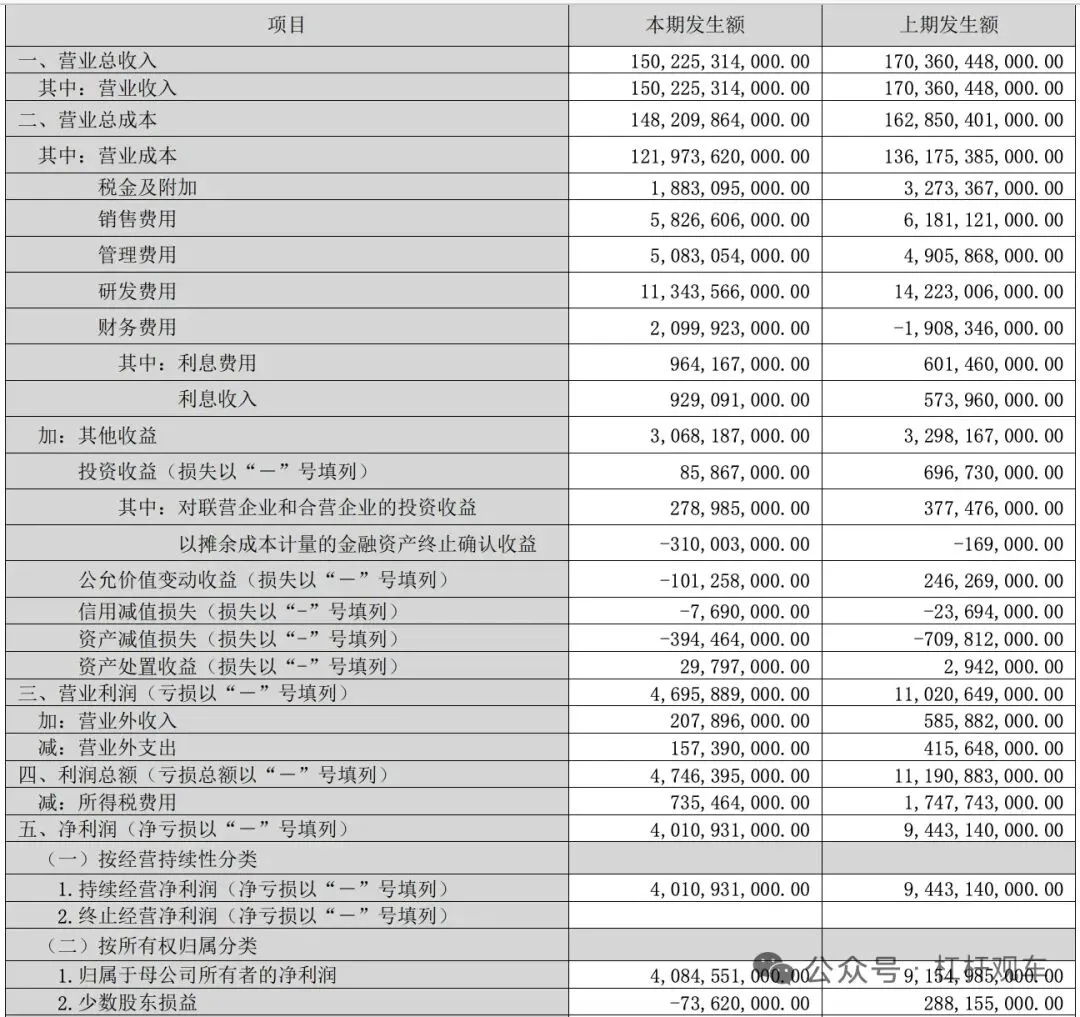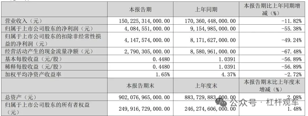 季度营收为 1502.25 亿,比去年同期的 1703.6 亿元下滑了 11.81%;归属于上市公司股东的净利润为40.85亿元,同比去年同期的91.55亿下滑了55.38%。