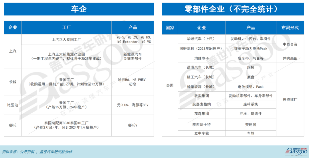 据盖世汽车不完全统计,截至目前,已有10余家中国整车及零部件企业宣布或已经在泰国建厂,预估总投资额高达数百亿元人民币。其中,长城汽车收购通用汽车泰国工厂,比亚迪在泰国罗勇府开工建厂,长安汽车、哪吒汽车也已经在泰国建设新能源车生产厂,广汽埃安于今年6月宣布在泰国开展本地化生产;华域汽车,国轩高科,均胜电子,蜂巢能源与敏实集团等零部件企业也以不同形式出海泰国。