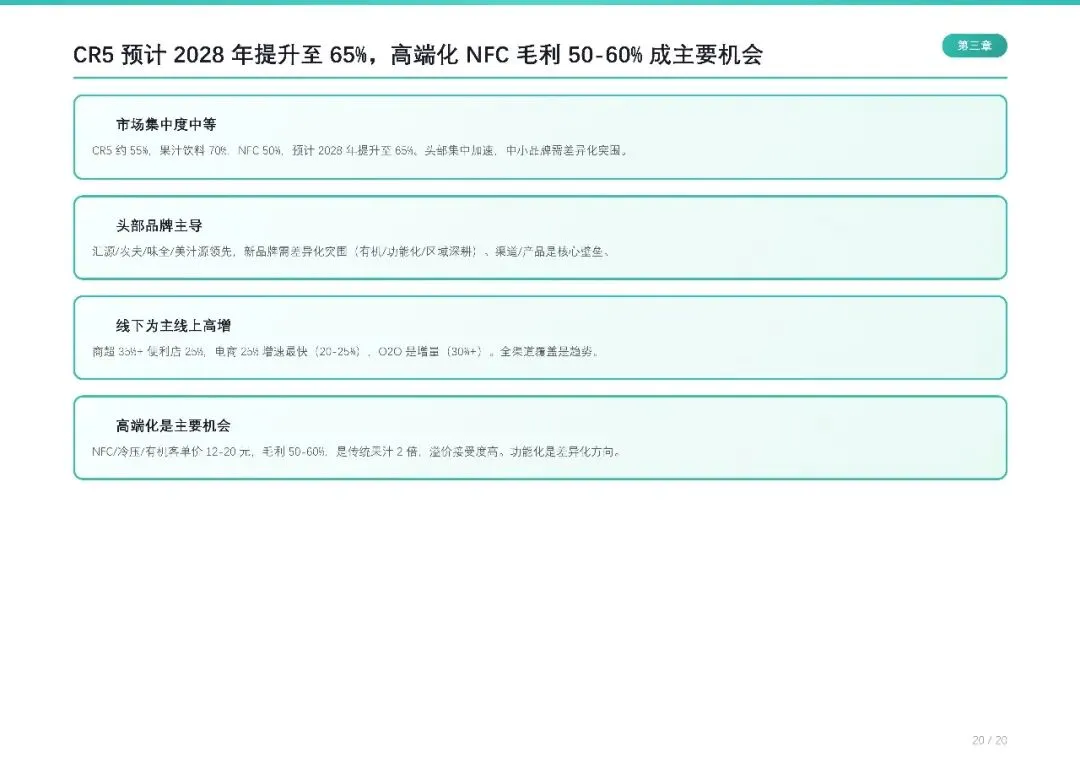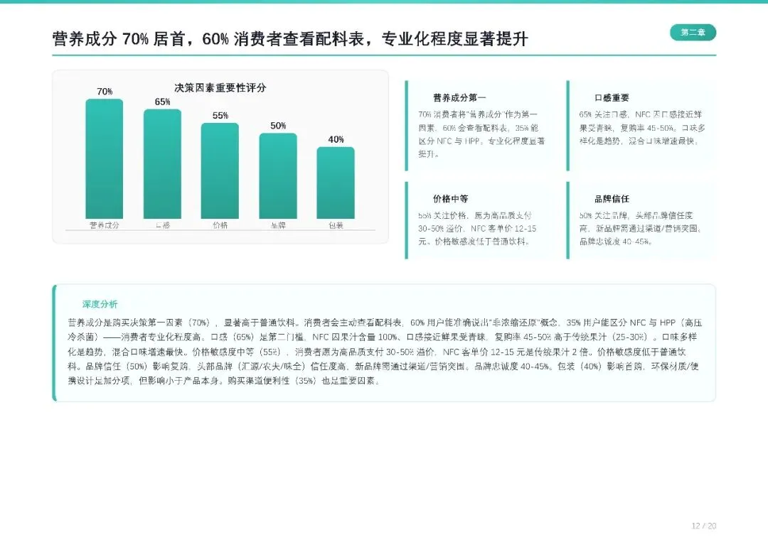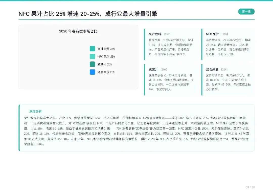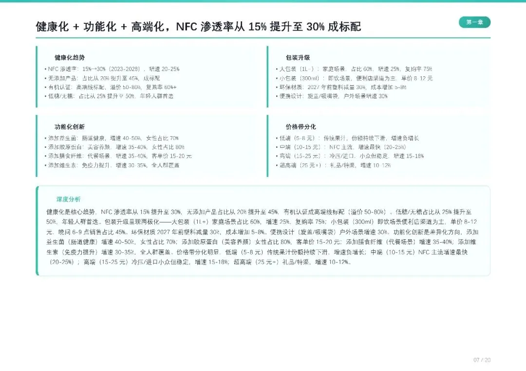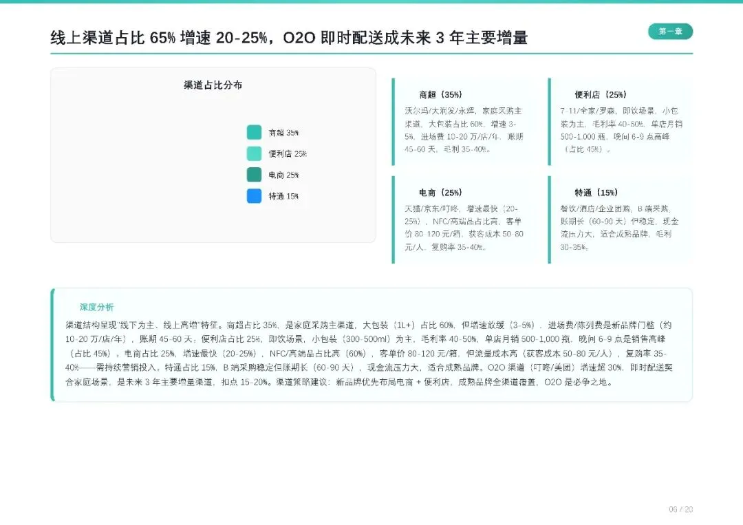 NFC果汁引领消费升级,成为行业最大增量引擎,占比达25%,增速保持20-25%。健康意识提升促使消费者偏好无添加、低糖产品,营养成分成购买首要因素。家庭消费场景为主,大包装需求增长,复购率高。线上渠道增速显著,O2O即时配送成新增长点。