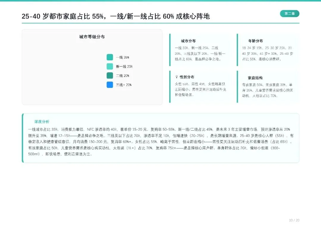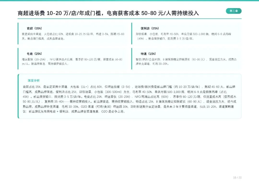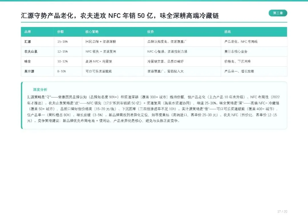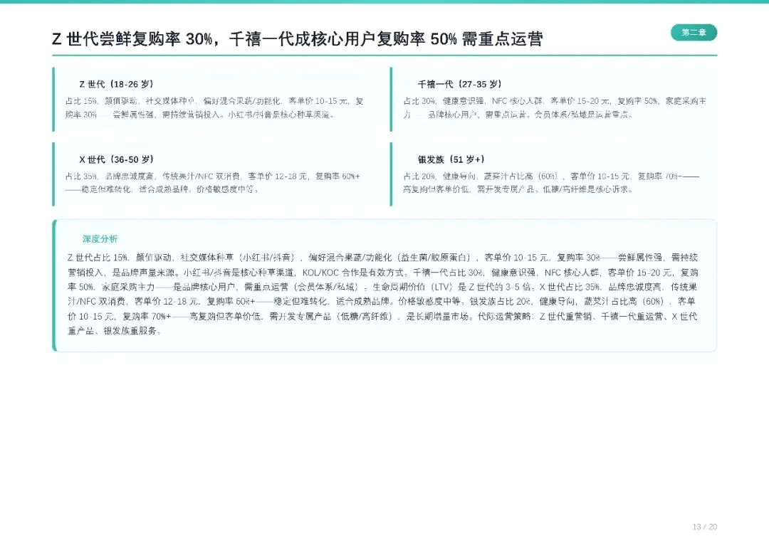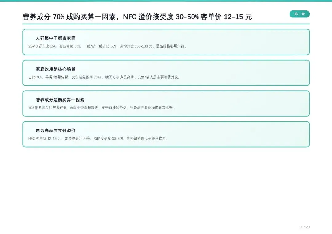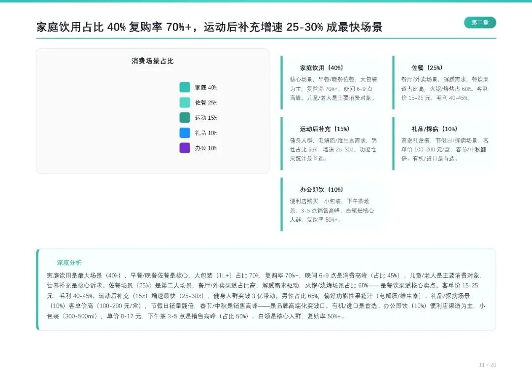 NFC果汁引领消费升级,成为行业最大增量引擎,占比达25%,增速保持20-25%。健康意识提升促使消费者偏好无添加、低糖产品,营养成分成购买首要因素。家庭消费场景为主,大包装需求增长,复购率高。线上渠道增速显著,O2O即时配送成新增长点。