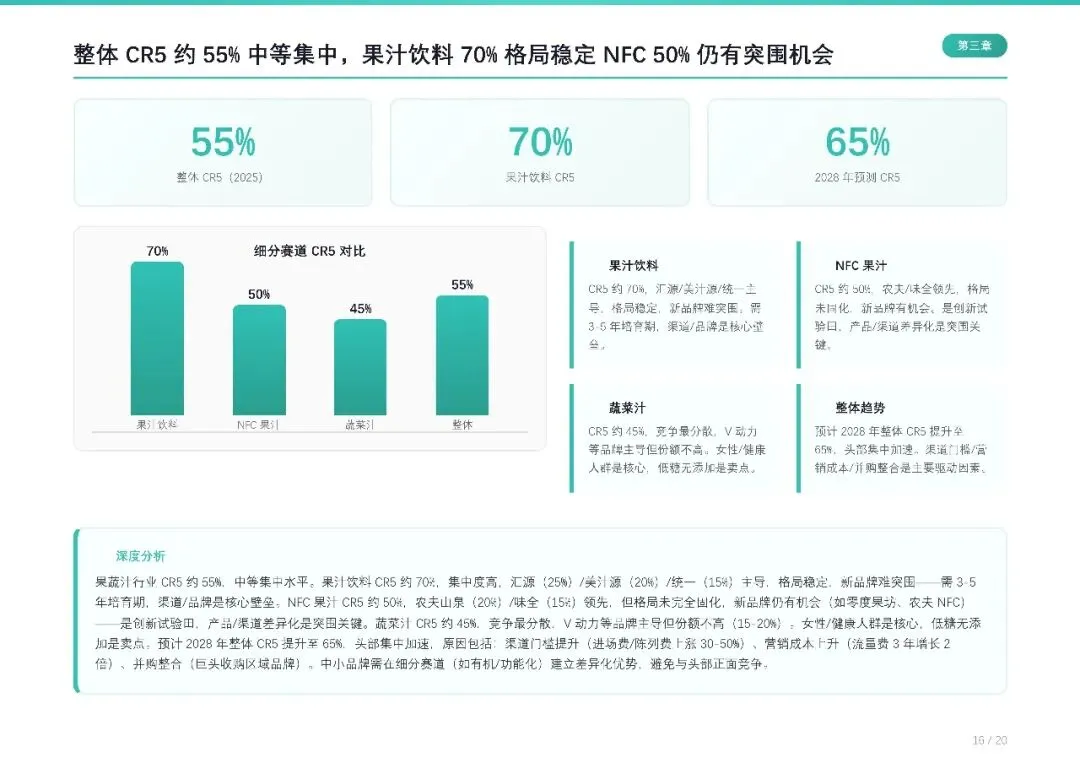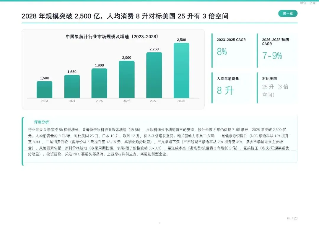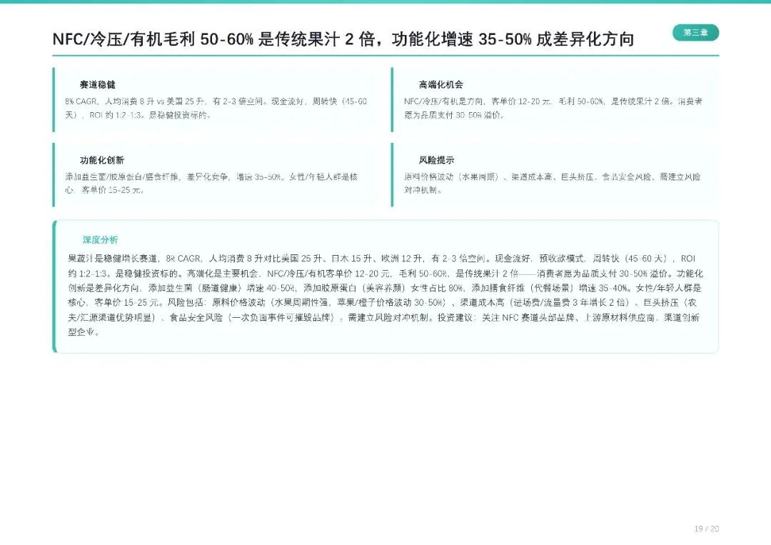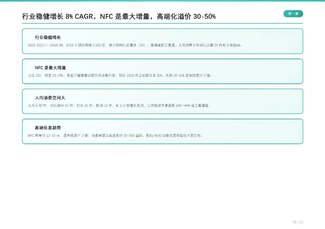行业呈现高端化趋势,NFC果汁客单价是传统果汁两倍,消费者愿为高品质支付溢价。功能化创新成为差异化方向,益生菌、胶原蛋白等功能成分增速快。市场集中度中等,NFC赛道格局未固化,新品牌有机会突围。整体而言,果蔬汁行业稳健增长,高端化、功能化成主要趋势。