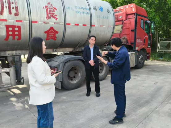 在濮阳训达粮油股份有限公司,张庆林深入生产运输衔接环节,细致查阅罐车使用台账、清洗消毒登记资料,详细询问罐车日常维护、清洗流程规范及人员操作要求。他强调,散装食用植物油运输是质量安全的关键环节,企业要严格落实源头管控责任,装车前必须对罐车进行全面清洁消杀,确保无残留、无污染,同时规范执行运输联单管理制度,实现运输全过程可追溯,全方位筑牢食用植物油质量安全防线。