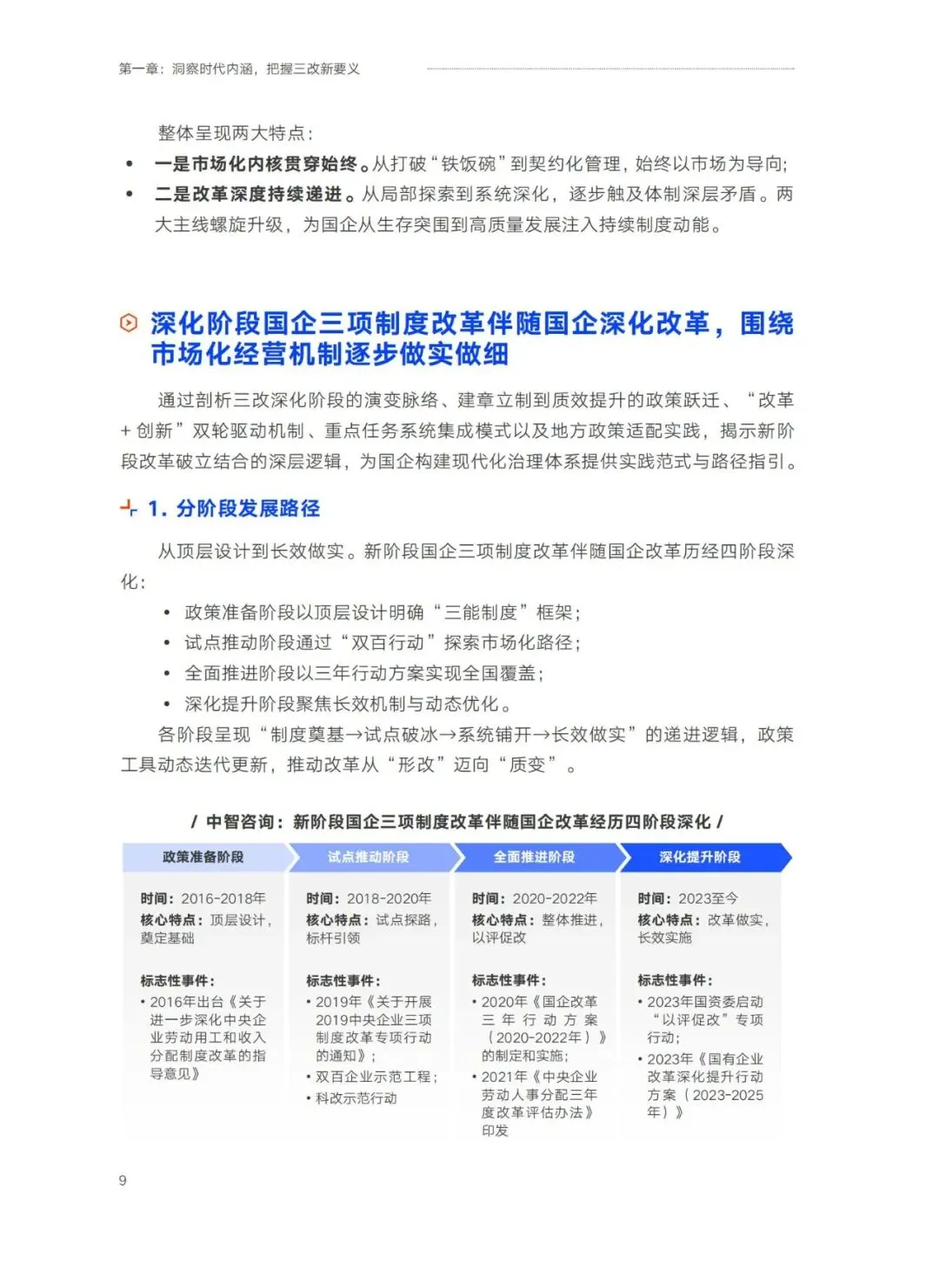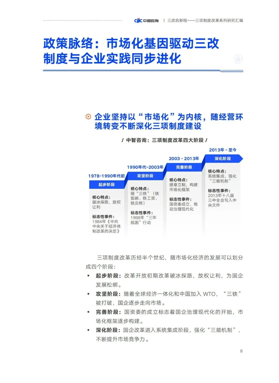 国企三项制度改革聚焦人事、劳动用工、收入分配三大领域,核心是构建管理人员能上能下、员工能进能出、收入能增能减的市场化经营机制,是国企完善现代企业制度、提升核心竞争力的关键举措。改革历经起步、攻坚、完善、深化四个阶段,始终以市场化为核心,从制度搭建转向质效提升,与国企改革深化提升行动、十五五战略规划深度协同。
