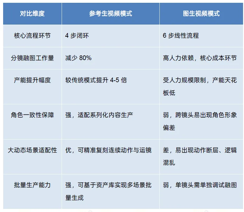 真正的变革在于生产逻辑的根本转变:从“图生视频”的线性、高人力依赖模式,升级为“参考生视频”的资产驱动模式。