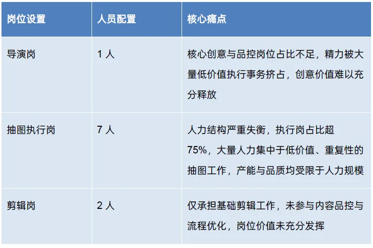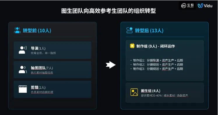 一个传统的10人图生团队,7个人陷在“抽图”的泥潭里,创意导演疲于奔命。转型后,变成13人的“多线并行”架构: