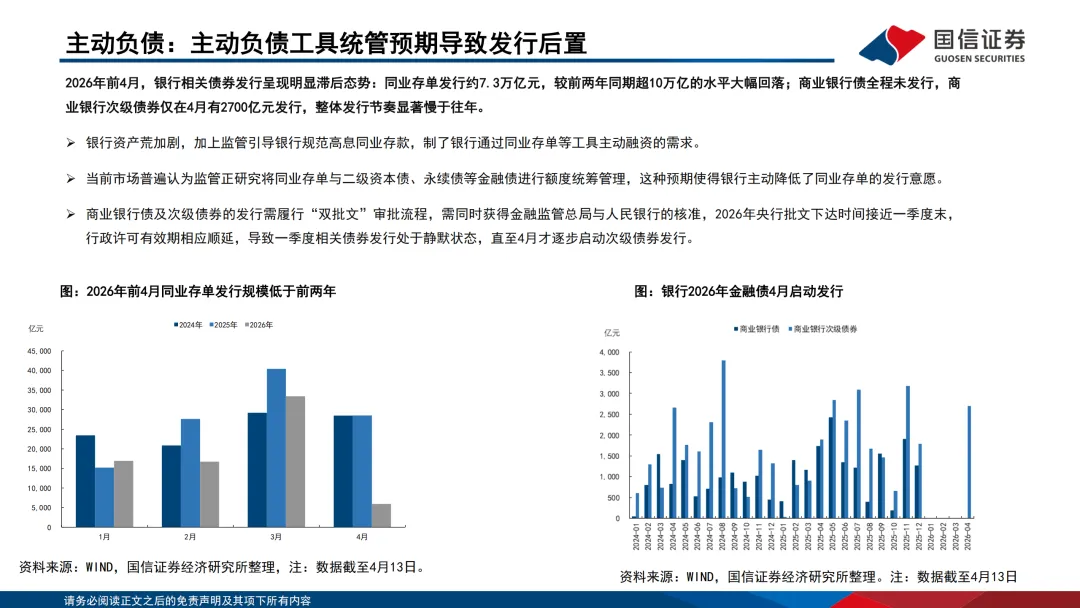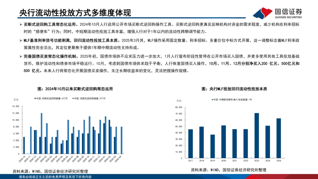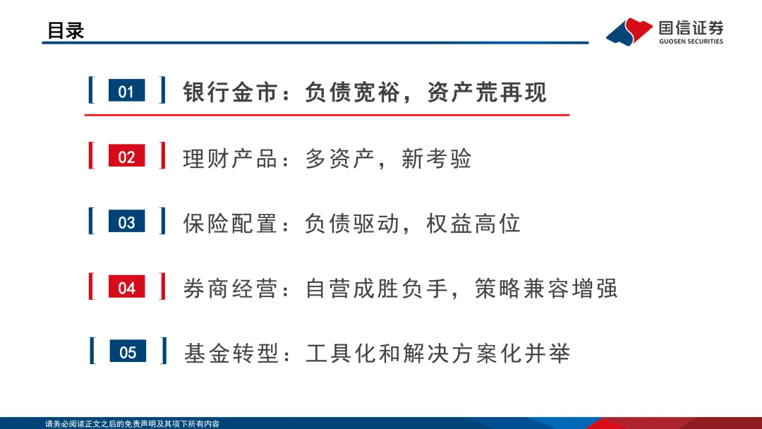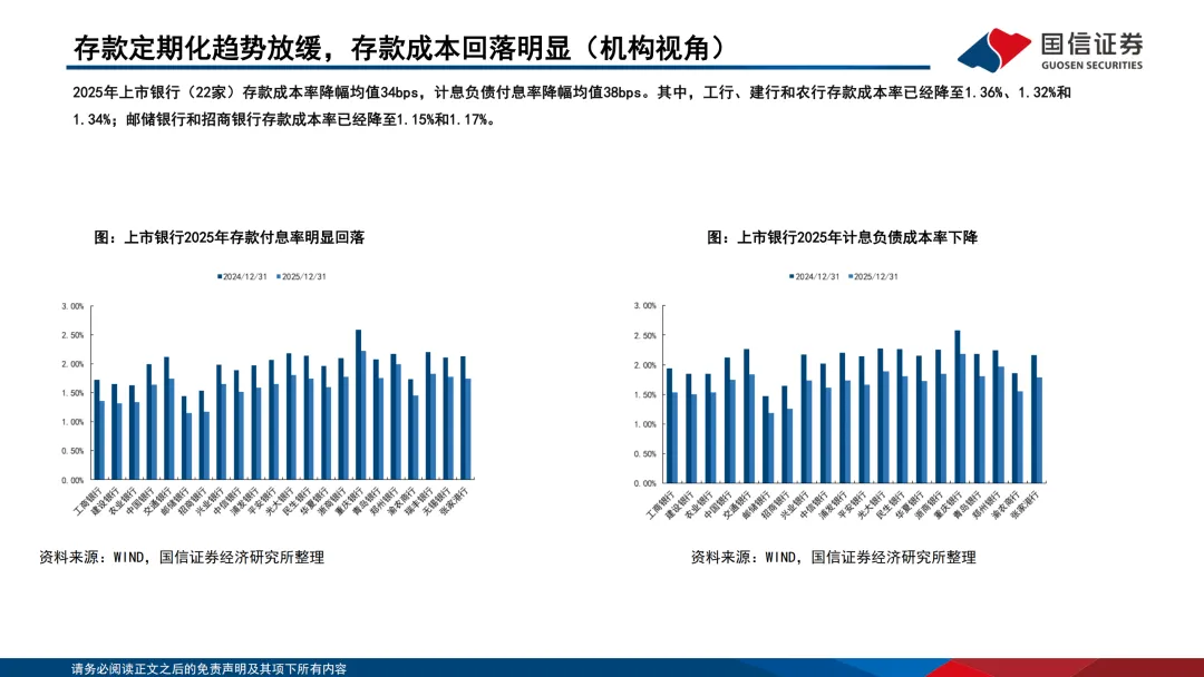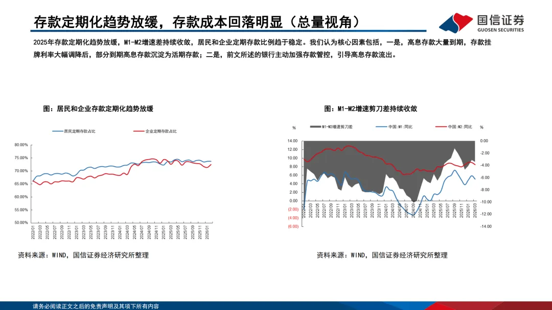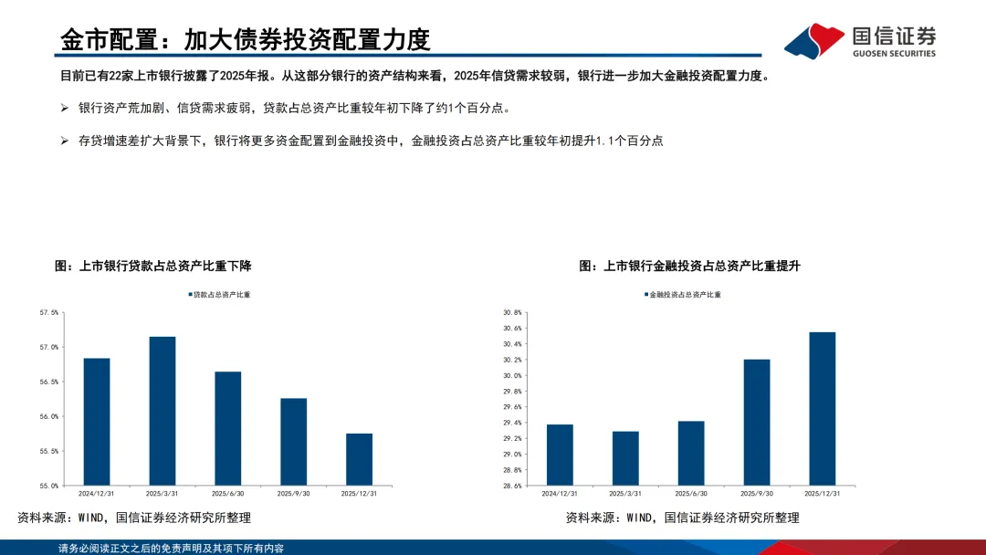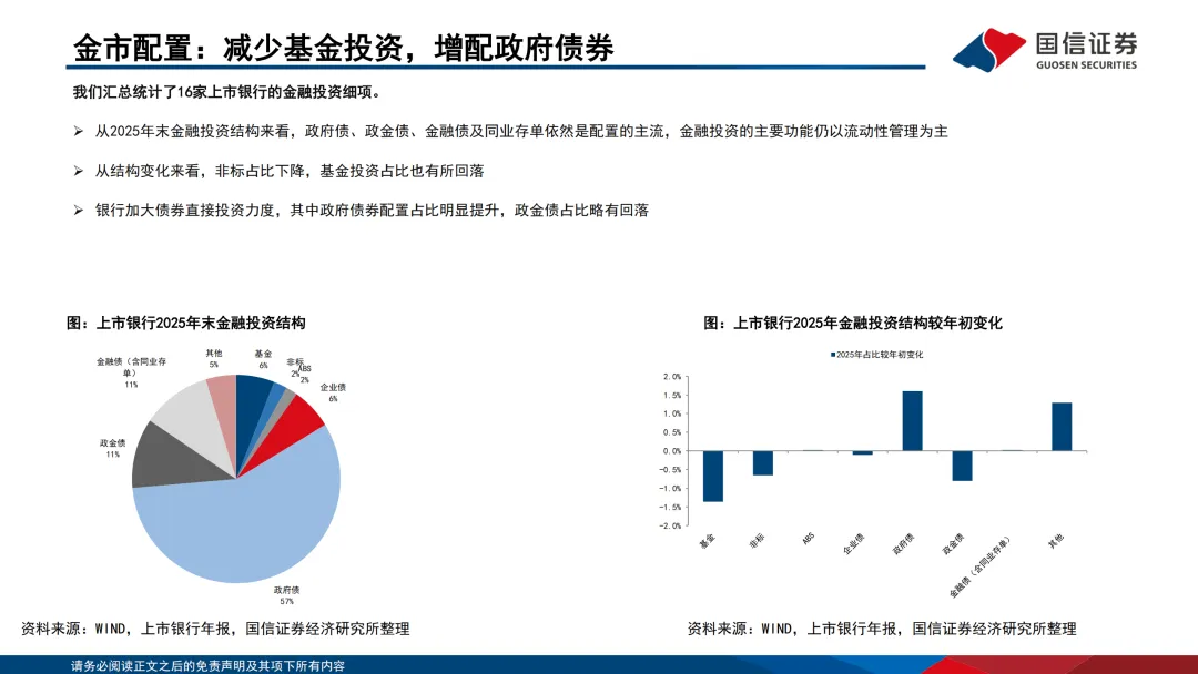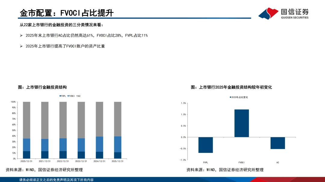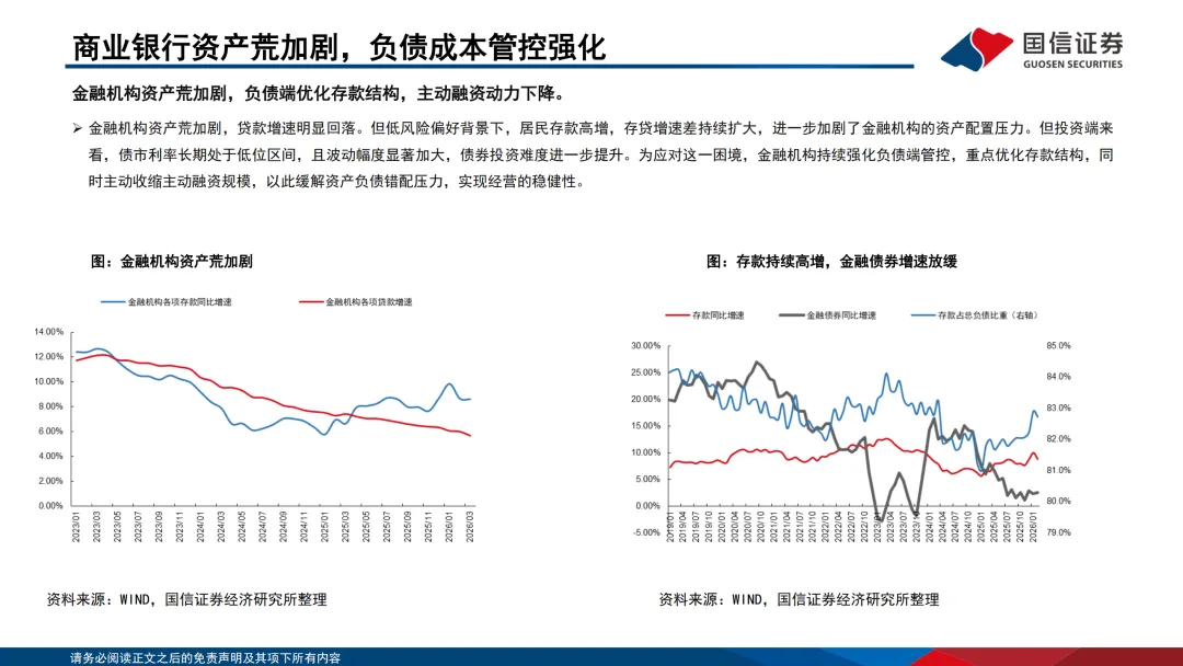 银行金市:2025年央行通过大幅增加“对其他存款性公司债权”向银行体系注入流动性,但商业银行仍面临显著“资产荒”压力。一方面,信贷需求疲弱导致贷款增速回落;另一方面,居民和企业存款持续高增,使得存贷增速差不断扩大。应对此困局,银行在资产端加大债券投资力度,特别是增配政府债券,并普遍提高FVOCI账户占比以平滑利润波动;在负债端则主动加强存款成本管控,使得存款定期化趋势放缓,整体负债成本明显回落。