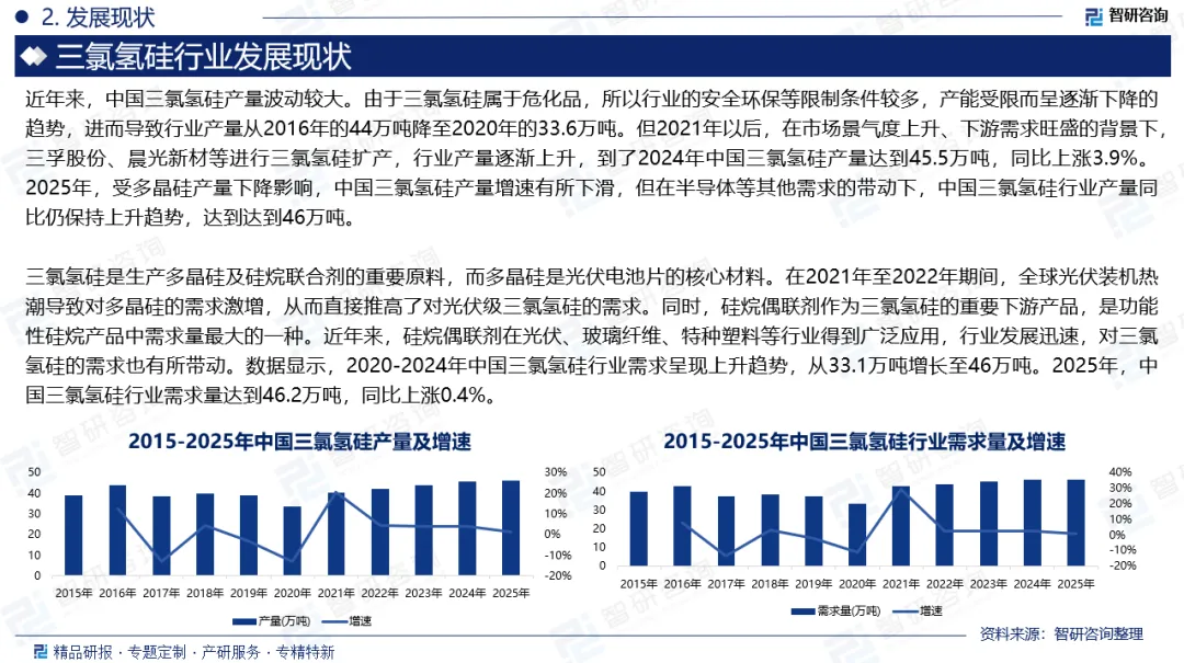三氯氢硅又称三氯硅烷、硅氯仿,是卤硅烷系列化合物中最重要的一种产品,沸点为31.8℃、极易水解、冒白烟、有盐酸气味、有毒,三氯氢硅气体与氧气或空气的混合物极易燃烧,遇湿易燃物品,遇明火强烈燃烧,与氧化剂发生反应,有燃烧危险。极易挥发,在空气中发烟,遇水或水蒸气能产生热和有毒的腐蚀性烟雾。三氯氢硅是生产多晶硅及硅烷联合剂的重要原料,而多晶硅是光伏电池片的核心材料。在2021年至2022年期间,全球光伏装机热潮导致对多晶硅的需求激增,从而直接推高了对光伏级三氯氢硅的需求。同时,硅烷偶联剂作为三氯氢硅的重要下游产品,是功能性硅烷产品中需求量最大的一种。近年来,硅烷偶联剂在光伏、玻璃纤维、特种塑料等行业得到广泛应用,行业发展迅速,对三氯氢硅的需求也有所带动。数据显示,2020-2024年中国三氯氢硅行业需求呈现上升趋势,从33.1万吨增长至46万吨。2025年,受多晶硅产能调整影响,三氯氢硅行业需求量增速有所下滑。但在半导体等其他需求的带动下,中国三氯氢硅行业需求量同比仍保持上升趋势,达到46.2万吨。