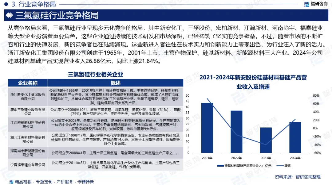 企业格局:从竞争格局来看,三氯氢硅行业呈现多元化竞争的格局,其中新安化工、三孚股份、宏柏新材、江瀚新材、河南尚宇、福泰硅业等大型企业扮演着重要角色。这些企业通过持续的技术研发和市场深耕,已经构筑了坚实的竞争壁垒。不过,随着市场的不断扩容和行业的快速发展,新的竞争者也在陆续涌现。这些新进入者往往在技术实力和创新能力上表现出色,为行业注入了新的活力。