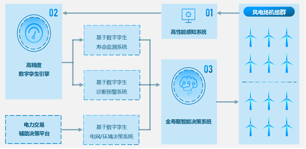 数字孪生系统。结合机组关键部件的在线实测数据,动态获得机组的剩余寿命;结合高性能感知系统、高精度数字孪生引擎和全寿期智能决策系统,实现机组真正意义的全生命周期闭环控制;综合考虑电价、电网、风参、载荷、运行策略发挥机组的真正潜力,实现从发电量最优到发电收益最优。