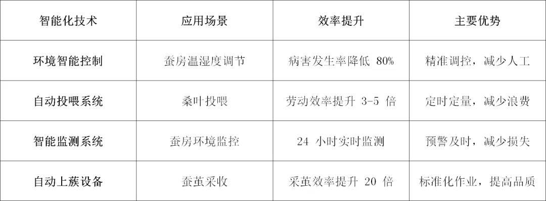 1.智能养蚕技术:浙江嵊州陌桑高科股份有限公司历时7年攻克全龄人工饲料工厂化养蚕技术,实现一年365天、全天24小时不间断养蚕产茧。该技术相比传统种桑养蚕可节省96%的桑园面积,节约成本30%以上,提高劳动效率500倍以上。四川石泉县推广"小蚕集中共育+大蚕分户饲养"新模式,将养蚕分为小蚕、中蚕、大蚕三个阶段,对蚕进行精准喂养,使全年养蚕由过去的3批次提高到6-7批次,促进蚕农收入稳步增长。