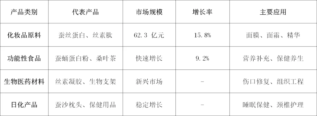 2.桑叶食品:桑叶食品市场快速增长,2025年市场规模达94.3亿元,年均复合增长率达10.7%。四川尚好茶业有限公司拥有13万亩标准茶桑基地,建设有6条桑茶生产线、3条桑叶粉生产线,以及桑食品、桑饮料、冻干等多条专业产线,智能设备和数字化工艺让桑叶成为"食补"的重要一环。云南陆良县引入浙江丝绸集团合作开发的桑叶茶,2025年销售额达1.2亿元。重庆大足区创新推出桑叶鱼、桑业鸡、桑叶蛋等模式,并开发出桑叶茶、蚕丝被等产品,拓展市场。