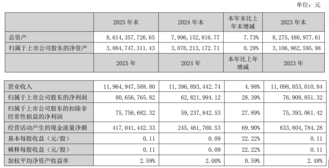 2025年度,营业收入119.65亿元,同比增长4.98%。归母净利润0.81亿元, 同比增长28.39%。详见如下数据: