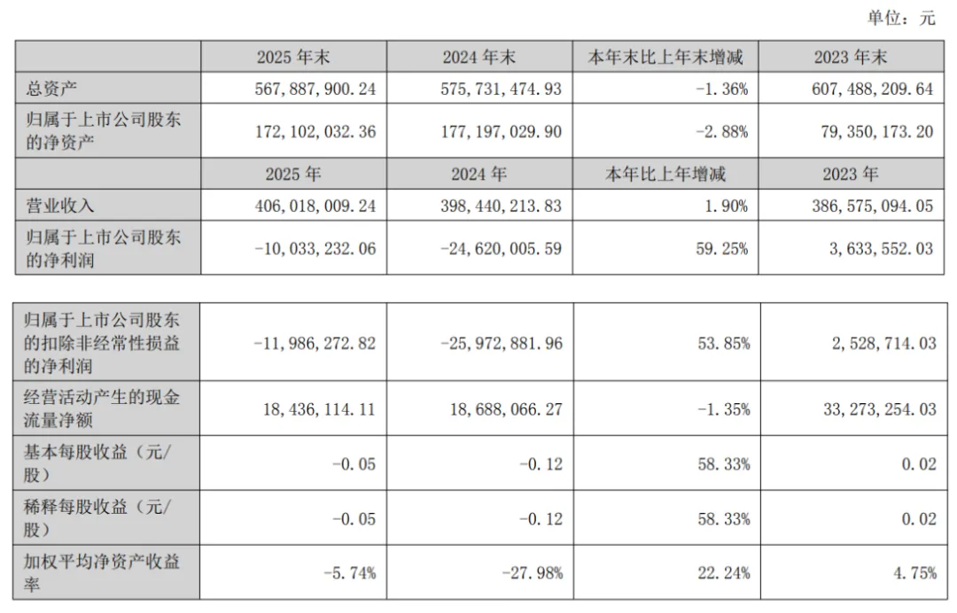 2025年度,营业收入4.06亿元,同比增长1.90%。归母净利润-0.10亿元, 同比增长59.25%。详见如下数据: