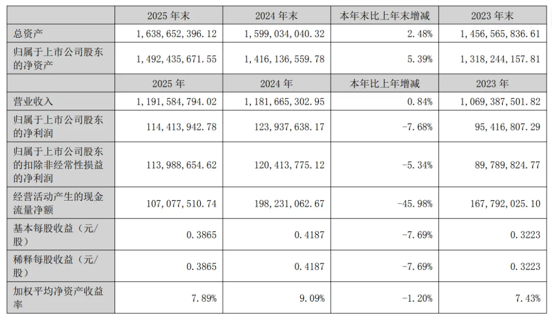 2025年度,营业收入11.92亿元,同比增长0.84%。归母净利润1.14亿元, 同比增长-7.68%。详见如下数据: