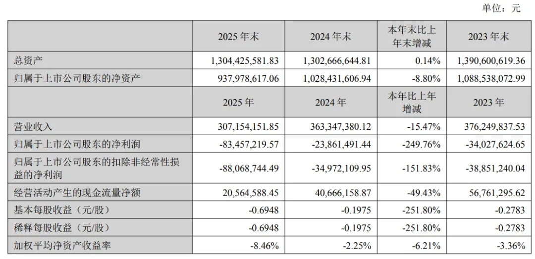 2025年度,营业收入3.07亿元,同比增长-15.47%。归母净利润-0.83亿元, 同比增长-249.76%。详见如下数据: