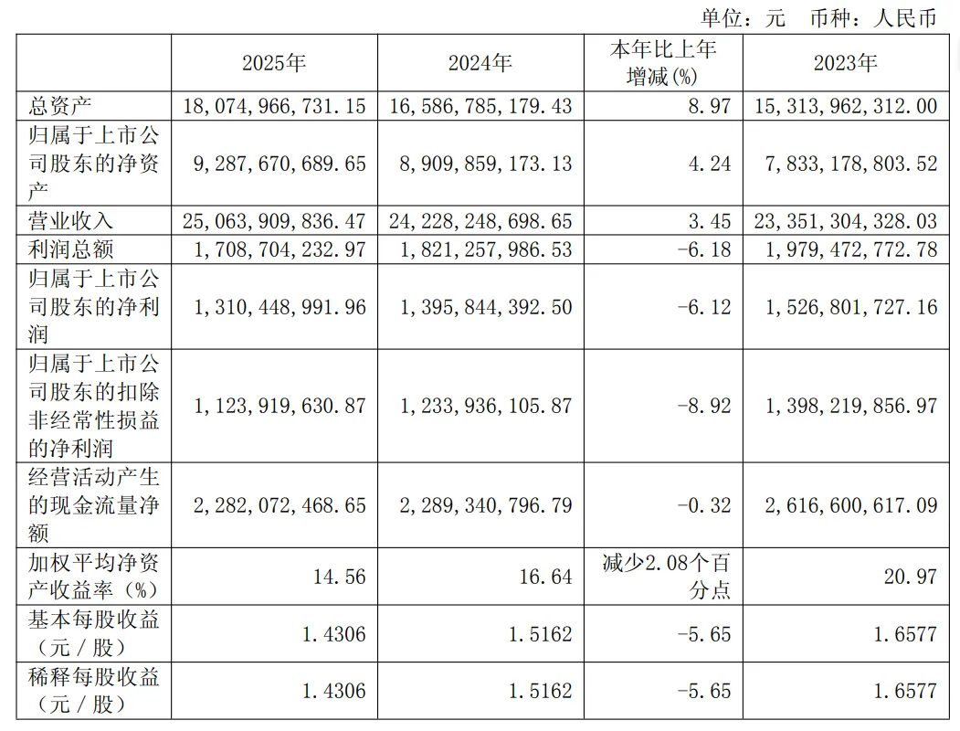 2025年度,营业收入250.64亿元,同比增长3.45%。归母净利润13.10亿元, 同比增长-6.12%。详见如下数据: