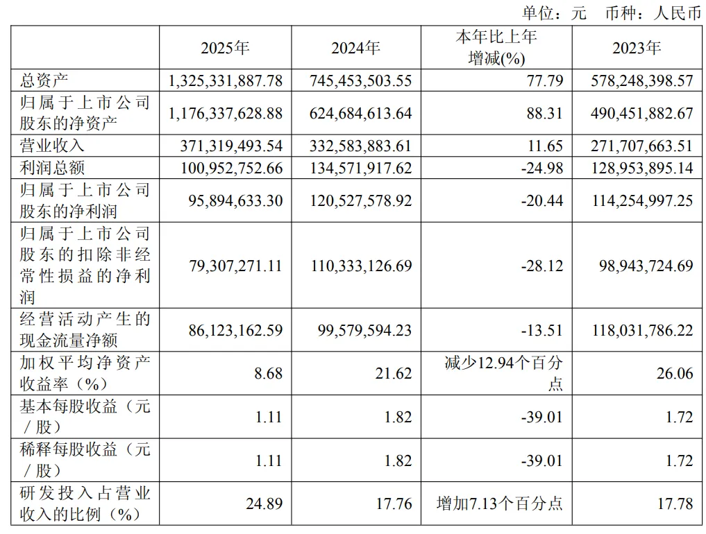 2025年度,营业收入3.71亿元,同比增长11.65%。归母净利润0.96亿元, 同比增长-20.44%。详见如下数据:
