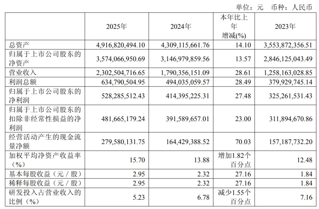 2025年度,营业收入23.03亿元,同比增长28.61%。归母净利润5.28亿元, 同比增长27.48%。详见如下数据: