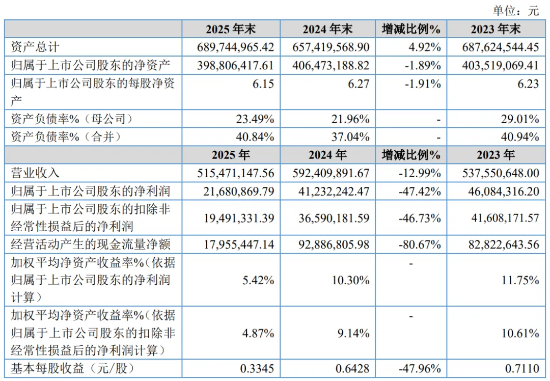 2025年度,营业收入5.15亿元,同比增长-12.99%。归母净利润0.22亿元, 同比增长-47.42%。详见如下数据: