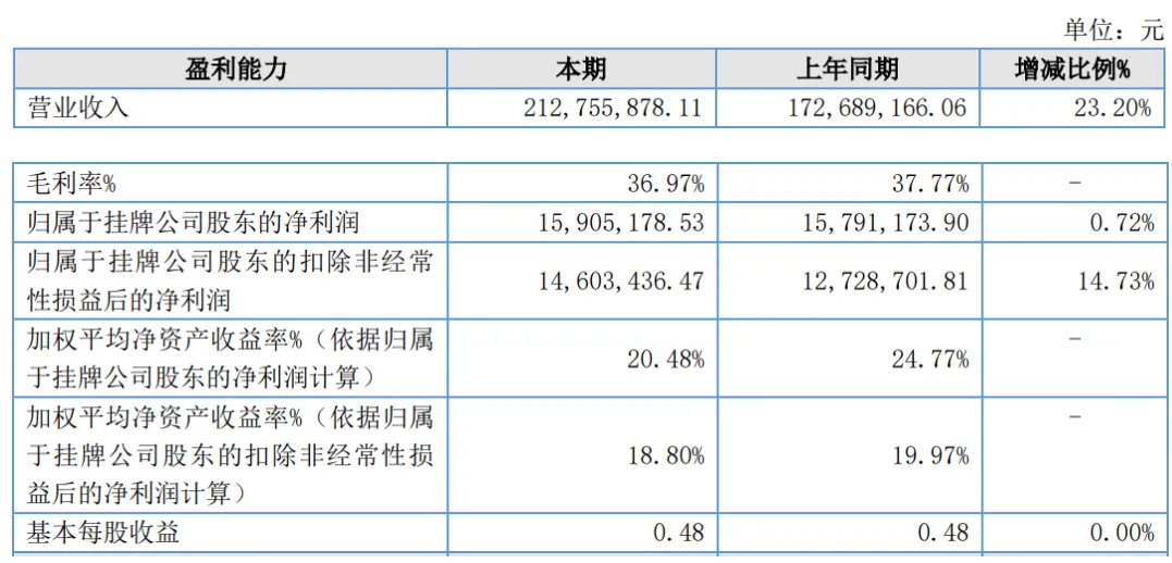 2025年度,营业收入2.13亿元,同比增长23.20%。归母净利润0.16亿元, 同比增长0.72%。详见如下数据: