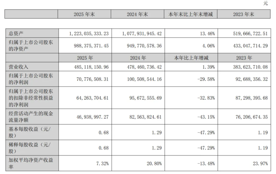 2025年度,营业收入4.85亿元,同比增长1.39%。归母净利润0.71亿元, 同比增长-29.58%。详见如下数据: