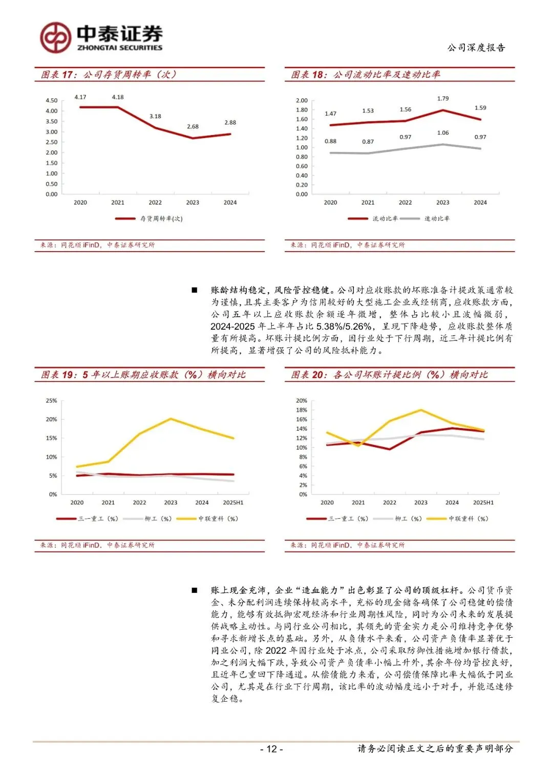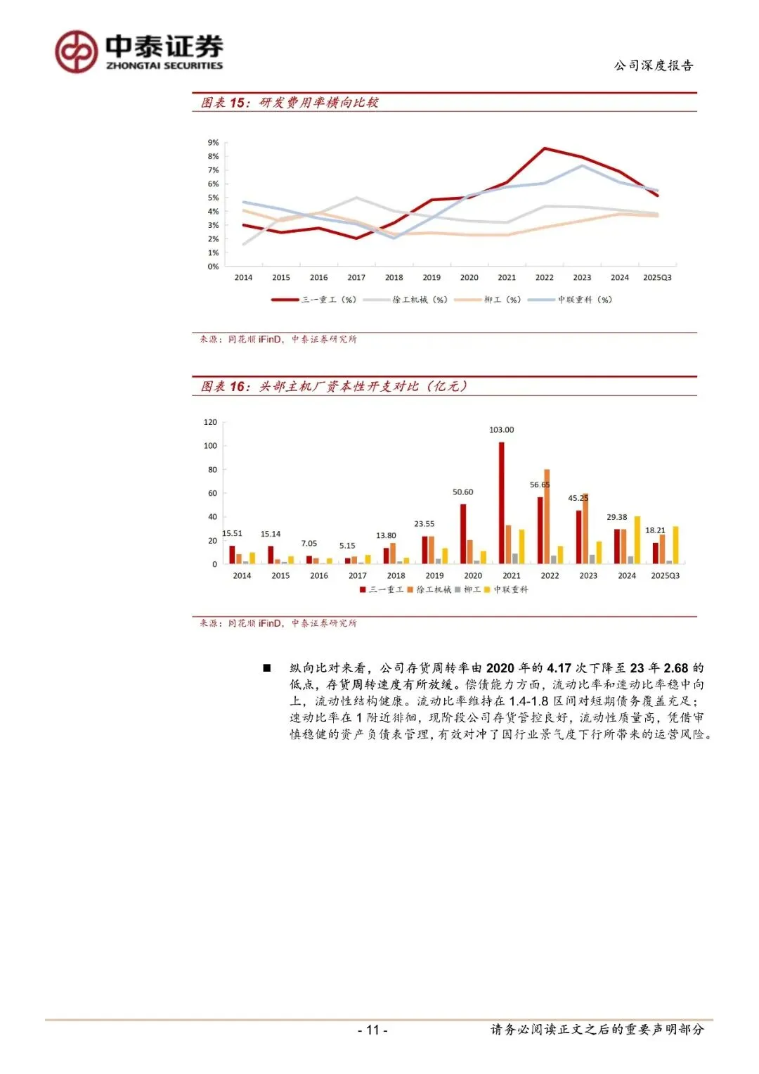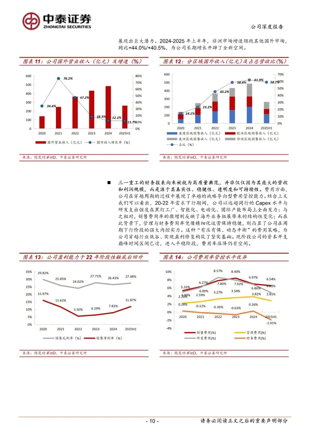 公司的财务报表向来被视为高质量典范,并非仅仅因为其宠大的营收和利润规模,而是源于其真实性、稳健性、透明度和可持续性。费用方面,公司在穿越周期的过程中展现了卓越的战略导向型费用管控能力。结合上文我们可以看出,20-22年需求下行期间,公司以远超同行的Capex水平与研发支出强度在黑灯丁工厂、智能化、电动化、国际产能布局上全面发力;与之相对,销售费用率的微增则反映了海外业务拓展带来的结构性变化;而在此背景下,管理与财务费用率凭借精细化运营保持稳健,则凸显了公司在周期下行阶段的强大内控实力。这种"有压有保、动态平衡"的费用策略,为公司穿越行业低谷、实现盈利修复构筑了坚实基础。现阶段公司的资本开支巅峰时间区间已过,进入平稳阶段,费用率压降仍有空间。
