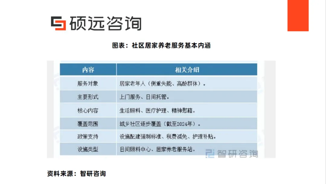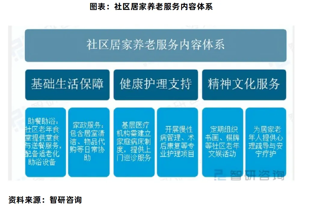3. 主流服务形式:上门服务、日间托管、社区养老驿站、健康管理中心。