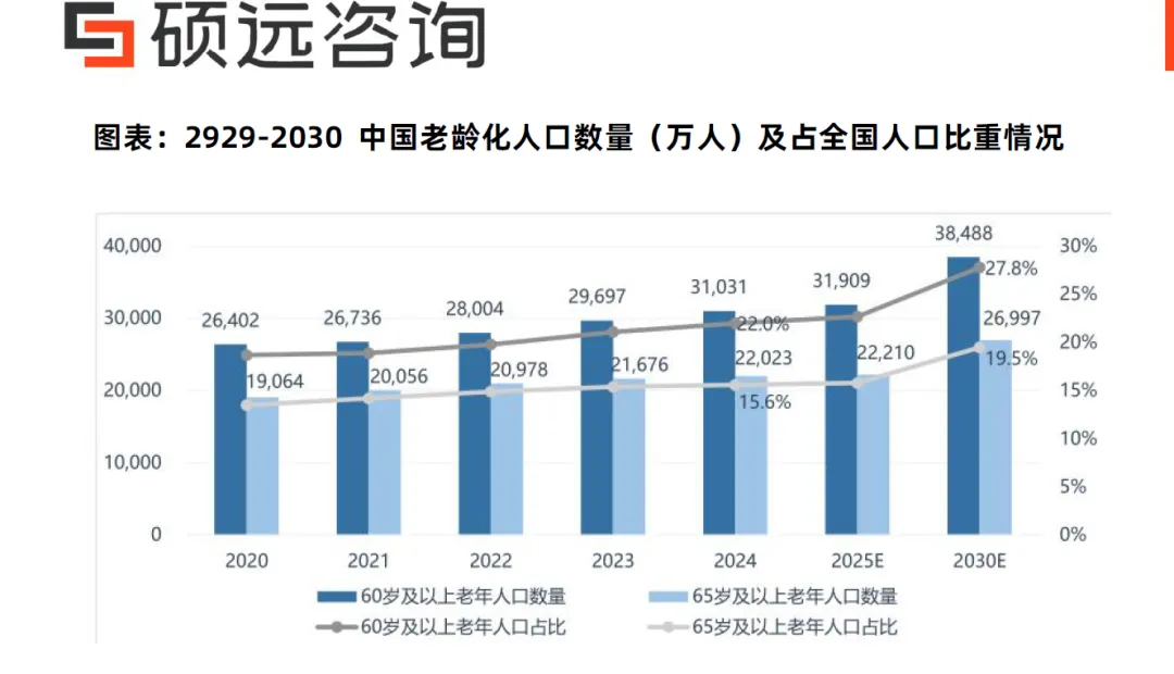 • 老龄化爆发:2030 年 60 岁以上人口占比将超25%,每 4 人就有 1 位老人。