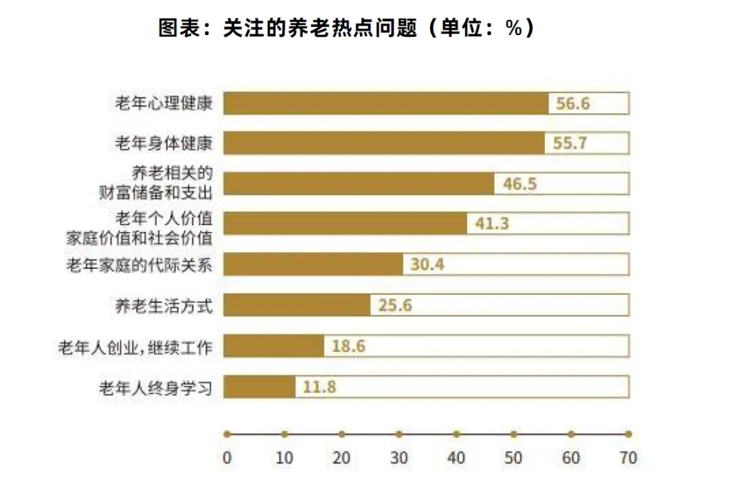 • 老年人最关注:心理健康、身体健康、财富储备三大问题。